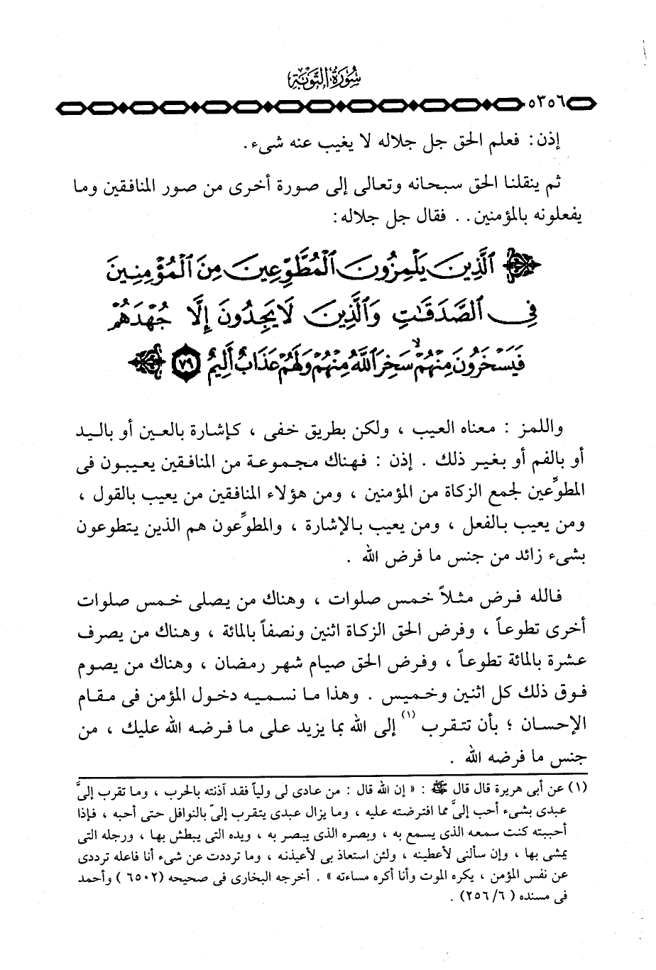 واللمز: معناه العيب، ولكن بطريق خفي، كإشارة بالعين أو باليد أو بالفم أو بغير ذلك. إذن: فهناك مجموعة من المنافقين يعيبون في المطوِّعين لجمع الزكاة من المؤمنين، ومن هؤلاء المنافقين من يعيب بالقول، ومن يعيب بالفعل، ومن يعيب بالإشارة، والمطوِّعون هم الذين يتطوعون بشيء زائد من جنس ما فرض الله.