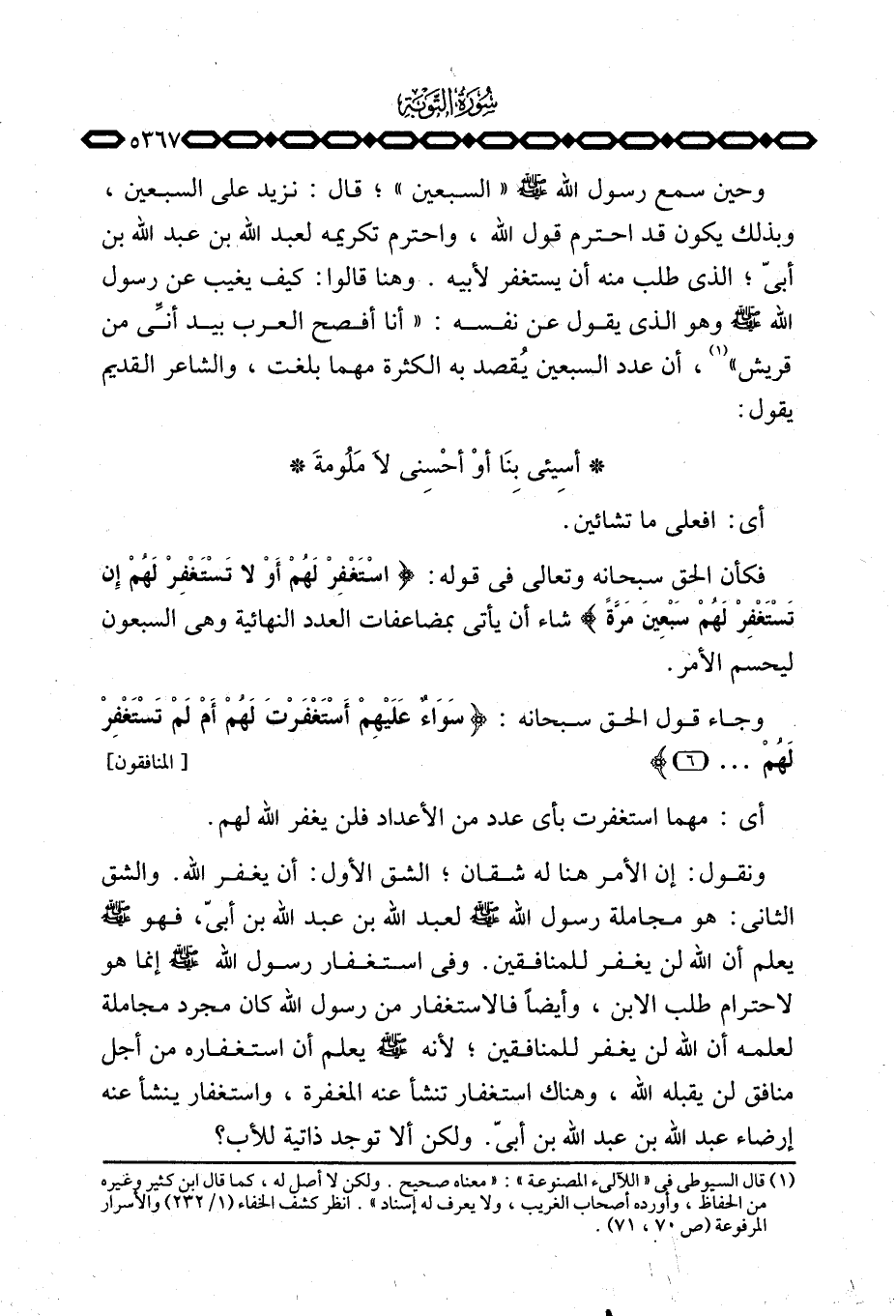 وحين سمع رسول الله صَلَّى اللَّهُ عَلَيْهِ وَسَلَّم َ «السبعين» ؛ قال: نزيد على السبعين، وبذلك يكون قد احترم قول الله، واحترم تكريمه لعبد الله بن عبد الله بن أبيّ؛ الذي طلب منه أن يستغفر لأبيه. وهنا قالوا: كيف يغيب عن رسول الله صَلَّى اللَّهُ عَلَيْهِ وَسَلَّم َ وهو الذي يقول عن نفسه: «أنا أفصح العرب بيد أنِّي من قريش» ، أن عدد السبعين يُقصد به الكثرة مهما بلغت، والشاعر القديم يقول: