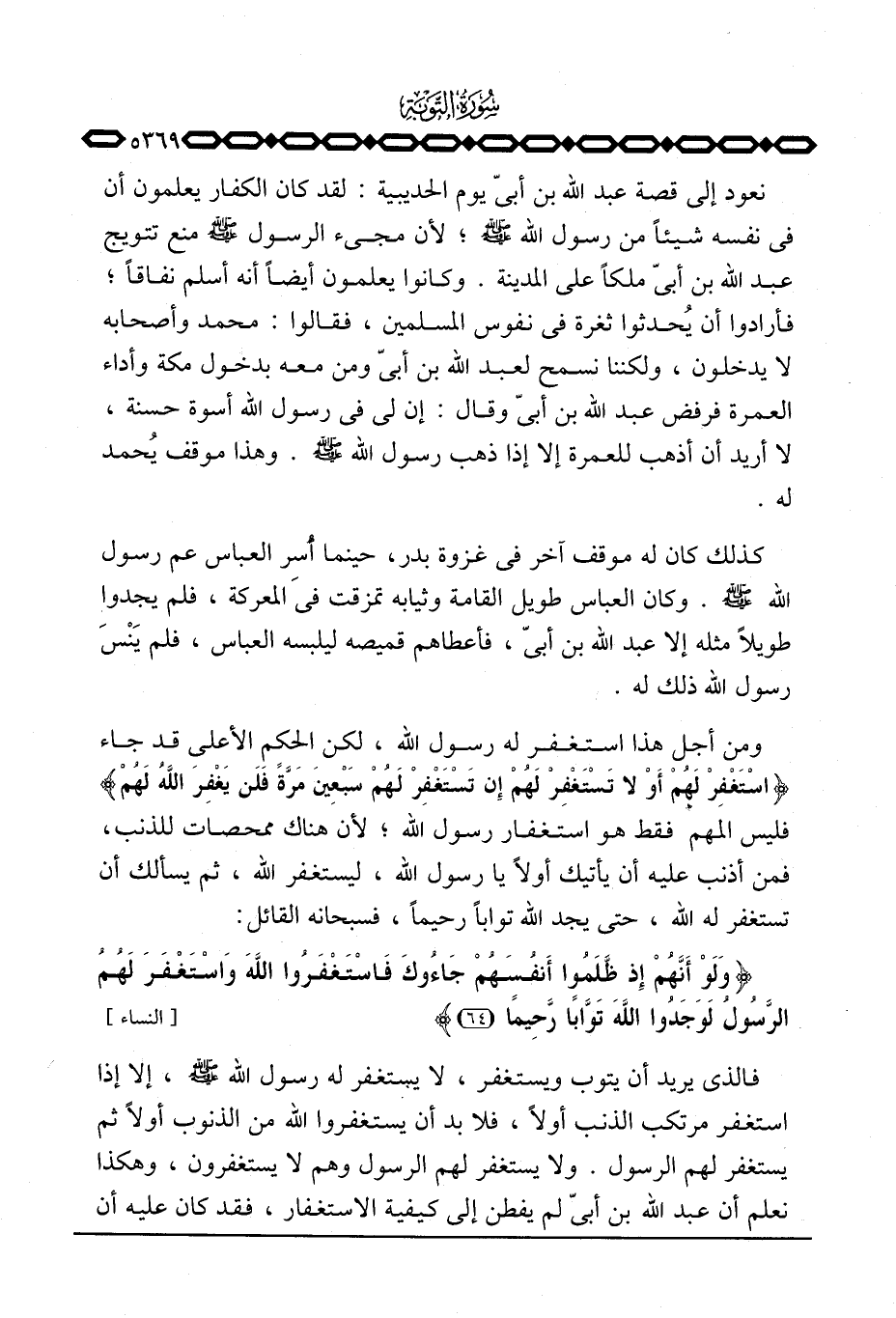 فالذي يريد أن يتوب ويستغفر، لا يستغفر له رسول الله صَلَّى اللَّهُ عَلَيْهِ وَسَلَّم َ، إلا إذا استغفر مرتكب الذنب أولاً، فلا بد أن يستغفروا الله من الذنوب أولاً ثم يستغفر لهم الرسول. ولا يستغفر لهم الرسول وهو لا يستغفرون، وهكذا نعلم أن عبد الله بن أبيّ لم يفطن إلى كيفية الاستغفار، فقد كان عليه أن