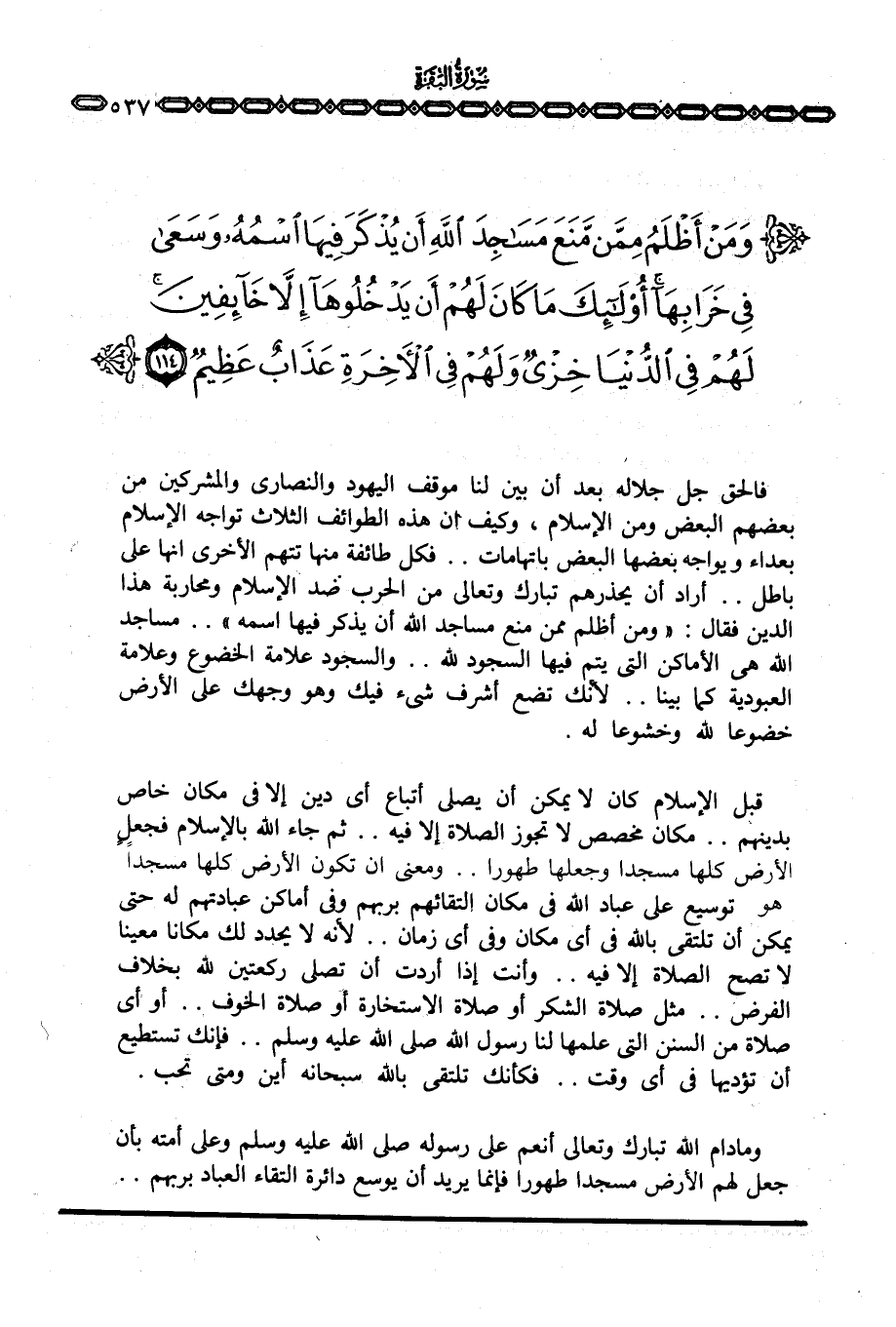 فالحق جل جلاله بعد أن بين لنا موقف اليهود والنصارى والمشركين من بعضهم البعض ومن الإسلام، وكيف أن هذه الطوائف الثلاث تواجه الإسلام بعداء ويواجه بعضها البعض باتهامات. . فكل طائفة منها تتهم الأخرى أنها على باطل. . أراد أن يحذرهم تبارك وتعالى من الحرب ضد الإسلام ومحاربة هذا الدين فقال: {وَمَنْ أَظْلَمُ مِمَّنْ مَّنَعَ مَسَاجِدَ الله أَن يُذْكَرَ فِيهَا اسمه} . . مساجد الله هي الأماكن التي يتم فيها السجود لله. . والسجود علامة الخضوع وعلامة العبودية كما بينا. . لأنك تضع أشرف شيء فيك وهو وجهك على الأرض خضوعا لله وخشوعا له.