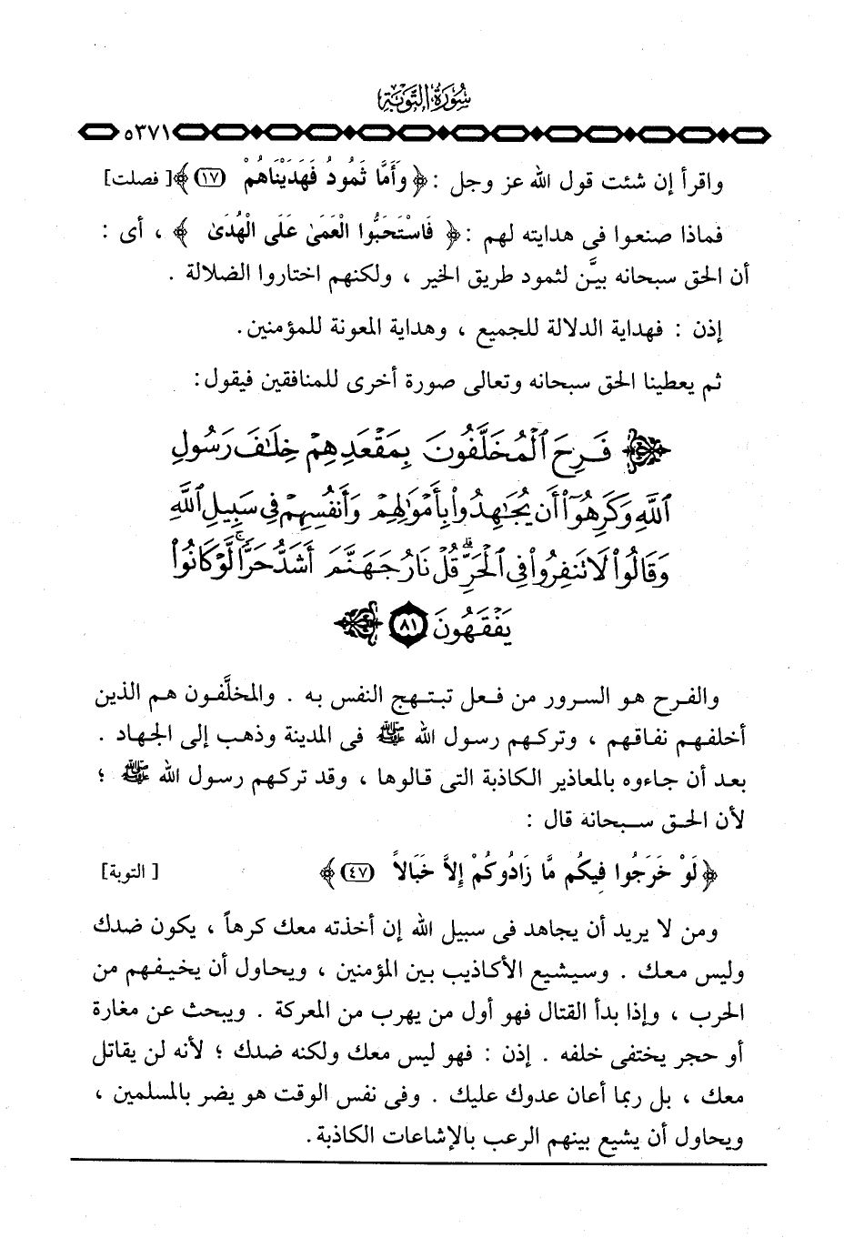 ومن لا يريد أن يجاهد في سبيل الله إن أخذته معك كرهاً، يكون ضدك وليس معك. وسيشيع الأكاذيب بين المؤمنين، ويحاول أن يخيفهم من الحرب، وإذا بدأ القتال فهو أول من يهرب من المعركة. ويبحث عن مغارة أو حجر يختفي خلفه. إذن: فهو ليس معك ولكنه ضدك؛ لأنه لن يقاتل معك، بل ربما أعان عدوك عليك. وفي نفس الوقت هو يضر بالمسلمين، ويحاول أن يشيع بينهم الرعب بالإشاعات الكاذبة.