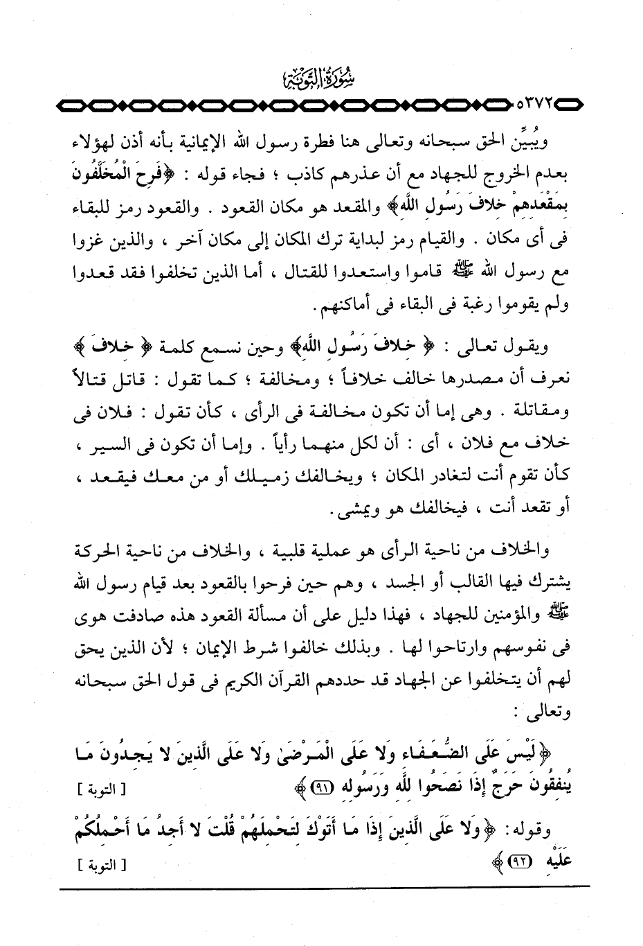 ويُبيِّن الحق سبحانه وتعالى هنا فطرة رسول الله الإيمانية بأنه أذن لهؤلاء بعدم الخروج للجهاد مع أن عذرهم كاذب؛ فجاء قوله: {فَرِحَ المخلفون بِمَقْعَدِهِمْ خِلاَفَ رَسُولِ الله} والمقعد هو مكان القعود. والقعود رمز للبقاء في أي مكان. والقيام رمز لبداية ترك المكان إلى مكان آخر، والذين غزوا مع رسول الله صَلَّى اللَّهُ عَلَيْهِ وَسَلَّم َ قاموا واستعدوا للقتال، أما الذين تخلفوا فقد قعدوا ولم يقوموا رغبة في البقاء في أماكنهم.