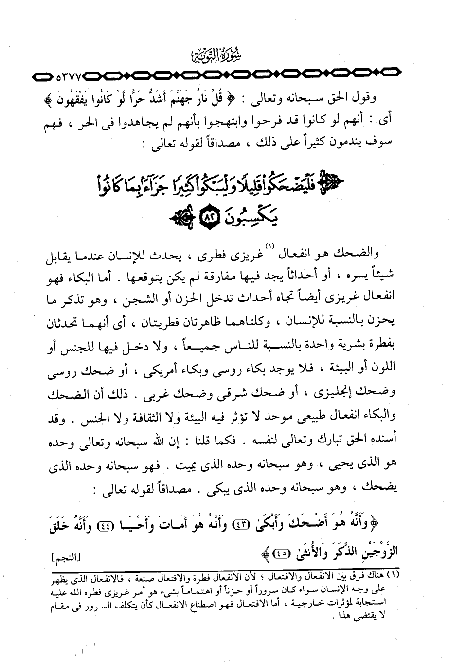 والضحك هو انفعال غريزي فطري، يحدث للإنسان عندما يقابل شيئاً يسره، أو أحداثاً يجد فيها مفارقة لم يكن يتوقعها. أما البكاء فهو انفعال غريزي أيضاً تجاه أحداث تدخل الحزن أو الشجن، وهو تذكر ما يحزن بالنسبة للإنسان. كلتاهما ظاهرتان فطريتان، أي أنهما تحدثان بفطرة بشرية واحدة بالنسبة للناس جميعاً، ولا دخل فيها للجنس أو اللون أو البيئة، فلا يوجد بكاء روسي وبكاء أمريكي، أو ضحك روسي وضحك إنجيلزي، أو ضحك شرقي وضحك غربي. ذلك أن الضحك والبكاء انفعال طبيعي موحد لا تؤثر فيه البيئة ولا الثقافة ولا الجنس. وقد أسنده الحق تبارك وتعالى لنفسه. فكما قلنا: إن الله سبحانه وتعالى وحده هو الذي يحيي، وهو سبحانه وحده الذي يميت. فهو سبحانه وحده الذي يضحك، وهو سبحانه وحده الذي يبكي. مصداقاً لقوله تعالى: {وَأَنَّهُ هُوَ أَضْحَكَ وأبكى وَأَنَّهُ هُوَ أَمَاتَ وَأَحْيَا وَأَنَّهُ خَلَقَ الزوجين الذكر والأنثى} [النجم: 43 - 45]