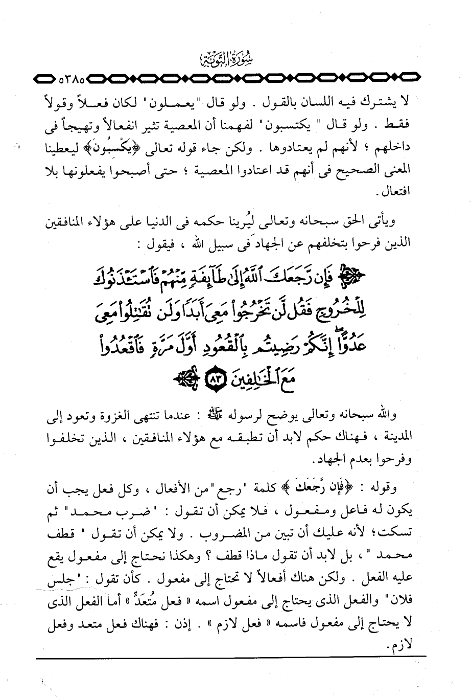 وقوله: {فَإِن رَّجَعَكَ} كلمة «رجع» من الأفعال، وكل فعل يجب أن يكون له فاعل ومفعول، فلا يمكن أن تقول: «ضرب محمد» ثم تسكت؛ لأنه عليك أن تبين من المضروب. ولا يمكن أن تقول «قطف محمد» ، بل لابد أن تقول ماذا قطف؟ وهكذا تحتاج إلى مفعول يقع عليه الفعل. ولكن هناك أفعالاً لا تحتاج إلى مفعول. كأن تقول: «جلس فلان» والفعل الذي يحتاج إلى مفعول اسمه «فعل مُتعَدٍّ» أما الفعل الذي لا يحتاج إلى مفعول فاسمه «فعل لازم» . إذن: فناك فعل متعد وفعل لازم.