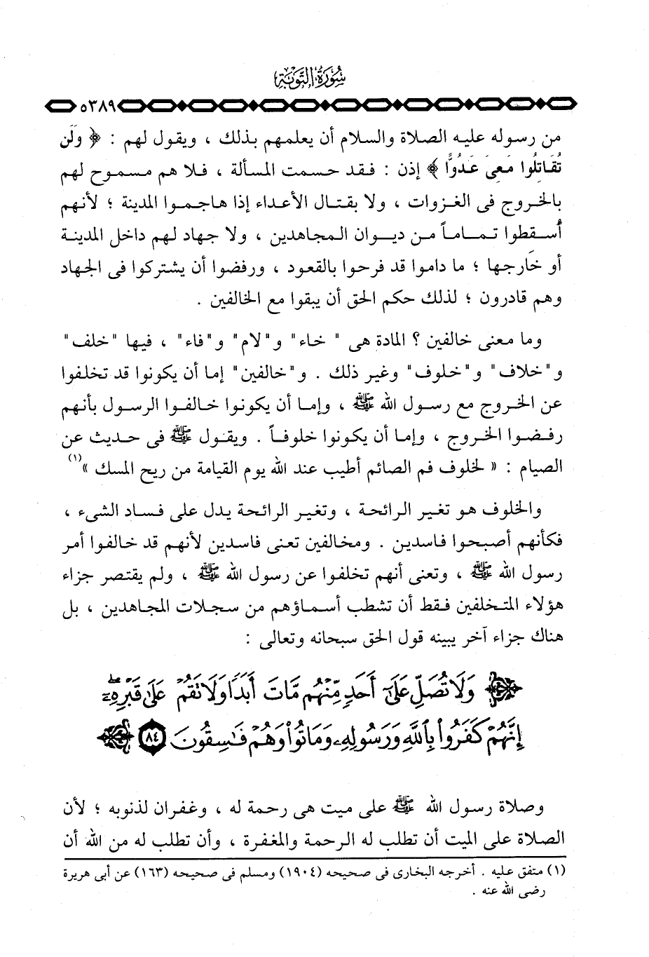 والخلوف هو تغير الرائحة، وتغير الرائحة يدل على فساد الشيء، فكأنهم أصبحوا فاسدين. ومخالفين تعني فاسدين لأنهم قد خالفوا أمر رسول الله صَلَّى اللَّهُ عَلَيْهِ وَسَلَّم َ، ول يقتصر جزاء هؤلاء المتخلفين فقط أن تشطب أسماؤهم من سجلات المجاهدين، بل هناك جزاء آخر يبينه قول الحق سبحانه وتعالى: {وَلاَ تُصَلِّ على أَحَدٍ ... }