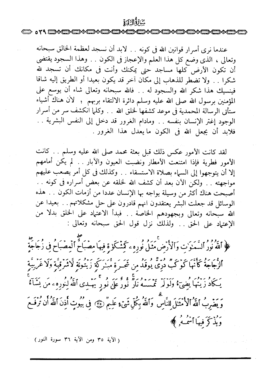 لقد كانت الأمور عكس ذلك قبل بعثة محمد صَلَّى اللَّهُ عَلَيْهِ وَسَلَّم َ. . كانت الأمور فطرية فإذا امتنعت الأمطار ونضبت العيون والآبار. . لم يكن أمامهم إلا أن يتوجهوا إلى السماء بصلاة الاستسقاء. . وكذلك في كل أمر يصعب عليهم مواجهته. . ولكن الآن بعد أن كشف الله لخلقه عن بعض أسراره في كونه. . أصبحت هناك أكثر من وسيلة يواجه بها الإنسان عددا من أزمات الكون. . هذه الوسائل قد جعلت البشر يعتقدون أنهم قادرون على حل مشكلاتهم. . بعيدا عن الله سبحانه وتعالى وبجهودهم الخاصة. . فبدأ الاعتماد على الخلق بدلا من الإعتماد على الحق. . ولذلك نزل قول الحق سبحانه وتعالى: {الله نُورُ السماوات والأرض مَثَلُ نُورِهِ كَمِشْكَاةٍ فِيهَا مِصْبَاحٌ المصباح فِي زُجَاجَةٍ الزجاجة كَأَنَّهَا كَوْكَبٌ دُرِّيٌّ يُوقَدُ مِن شَجَرَةٍ مُّبَارَكَةٍ زَيْتُونَةٍ لاَّ شَرْقِيَّةٍ وَلاَ غَرْبِيَّةٍ يَكَادُ زَيْتُهَا يضياء وَلَوْ لَمْ تَمْسَسْهُ نَارٌ نُّورٌ على نُورٍ يَهْدِي الله لِنُورِهِ مَن يَشَآءُ وَيَضْرِبُ الله الأمثال لِلنَّاسِ والله بِكُلِّ شَيْءٍ عَلَيِمٌ فِي بُيُوتٍ أَذِنَ الله أَن تُرْفَعَ وَيُذْكَرَ فِيهَا اسمه}