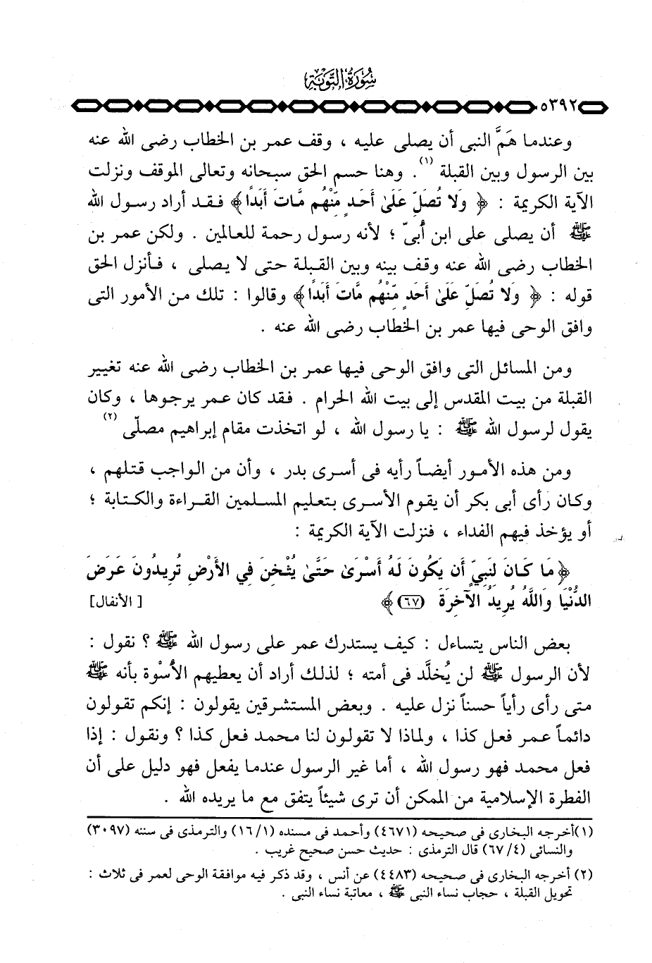 بعض الناس يتساءل: كيف يستدرك عمر على رسول الله صَلَّى اللَّهُ عَلَيْهِ وَسَلَّم َ؟ نقول: لأن الرسول صَلَّى اللَّهُ عَلَيْهِ وَسَلَّم َ لن يُخلَّد في أمته؛ لذلك أراد أن يعطيهم الأُسْوة بأنه صَلَّى اللَّهُ عَلَيْهِ وَسَلَّم َ متى رأى رأياً حسناً نزل عليه. وبعض المستشرقين يقولون: إنكم تقولون دائماً عمر فعل كذا، ولماذا لا تقولون لنا محمد فعل كذا؟ ونقول: إذا فعل محمد فهو رسول الله، أما غير الرسول عندما يفعل فهو دليل على أن الفطرة الإسلامية من الممكن أن ترى شيئاً يتفق مع ما يريده الله.