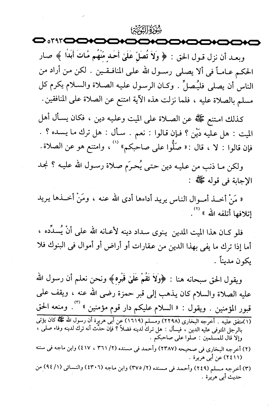كذلك امتنع صَلَّى اللَّهُ عَلَيْهِ وَسَلَّم َ عن الصلاة على الميت وعليه دين، «فكان يسأل أهل الميت: هل عليه دَيْن؟ فإن قالوا: نعم. سأل: هل تريد ما يسده؟ . فإن قالوا: لا، قال:» صَلُّوا على صاحبكم «، وامتنع هو عن الصلاة.»