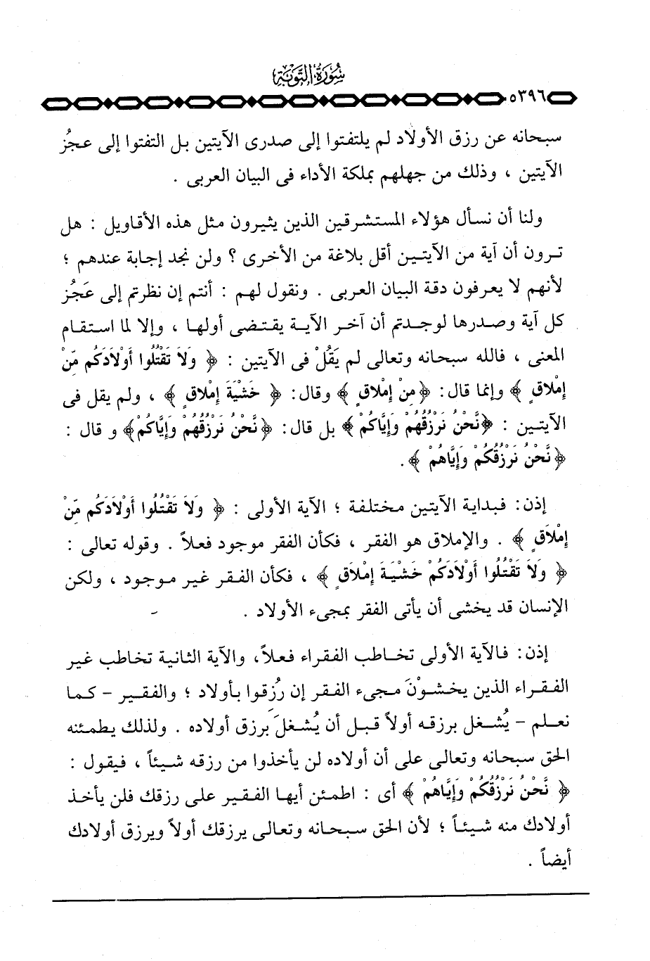 ولنا أن نسأل هؤلاء المستشرقين الذي يثيرون مثل هذه الأقاويل: هل ترون أن آية من الآيتين أقل بلاغة من الأخرى؟ ولن نجد إجابة عندهم؛ لأنهم لا يعرفون دقة البيان العربي. ونقول لهم: أنتم إن نظرتم إلى عَجُز كل آية وصدرها لوجدتم أن آخر الآية يقتضي أولها، وإلا لما استقام المعنى، فالله سبحانه وتعالى لم يَقُلٍ في الآيتين: {وَلاَ تقتلوا أَوْلاَدَكُمْ مِّنْ إمْلاَقٍ} وإنما قال: {مِّنْ إمْلاَقٍ} ، وقال: {خَشْيَةَ إِمْلاقٍ} ولم يقل في الآيتين: {نَّحْنُ نَرْزُقُهُمْ وَإِيَّاكُم} بل قال: {نَّحْنُ نَرْزُقُهُمْ وَإِيَّاكُم} وقال: {نَّحْنُ نَرْزُقُكُمْ وَإِيَّاهُمْ} .