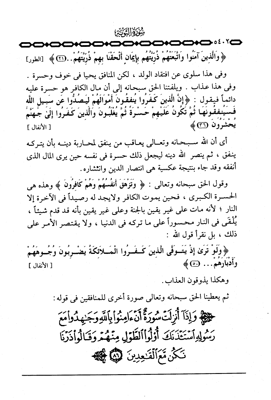 وفي هذا سلوى عن افتقاد الولد، لكن المنافق يحيا في خوف وحسرة. وفي هذا عذاب. ويلفتنا الحق سبحانه إلى أن مال الكافر هو حسرة عليه دائماً فيقول: {إِنَّ الذين كَفَرُواْ يُنفِقُونَ أَمْوَالَهُمْ لِيَصُدُّواْ عَن سَبِيلِ الله فَسَيُنفِقُونَهَا ثُمَّ تَكُونُ عَلَيْهِمْ حَسْرَةً ثُمَّ يُغْلَبُونَ والذين كفروا إلى جَهَنَّمَ يُحْشَرُونَ} [الأنفال: 36]