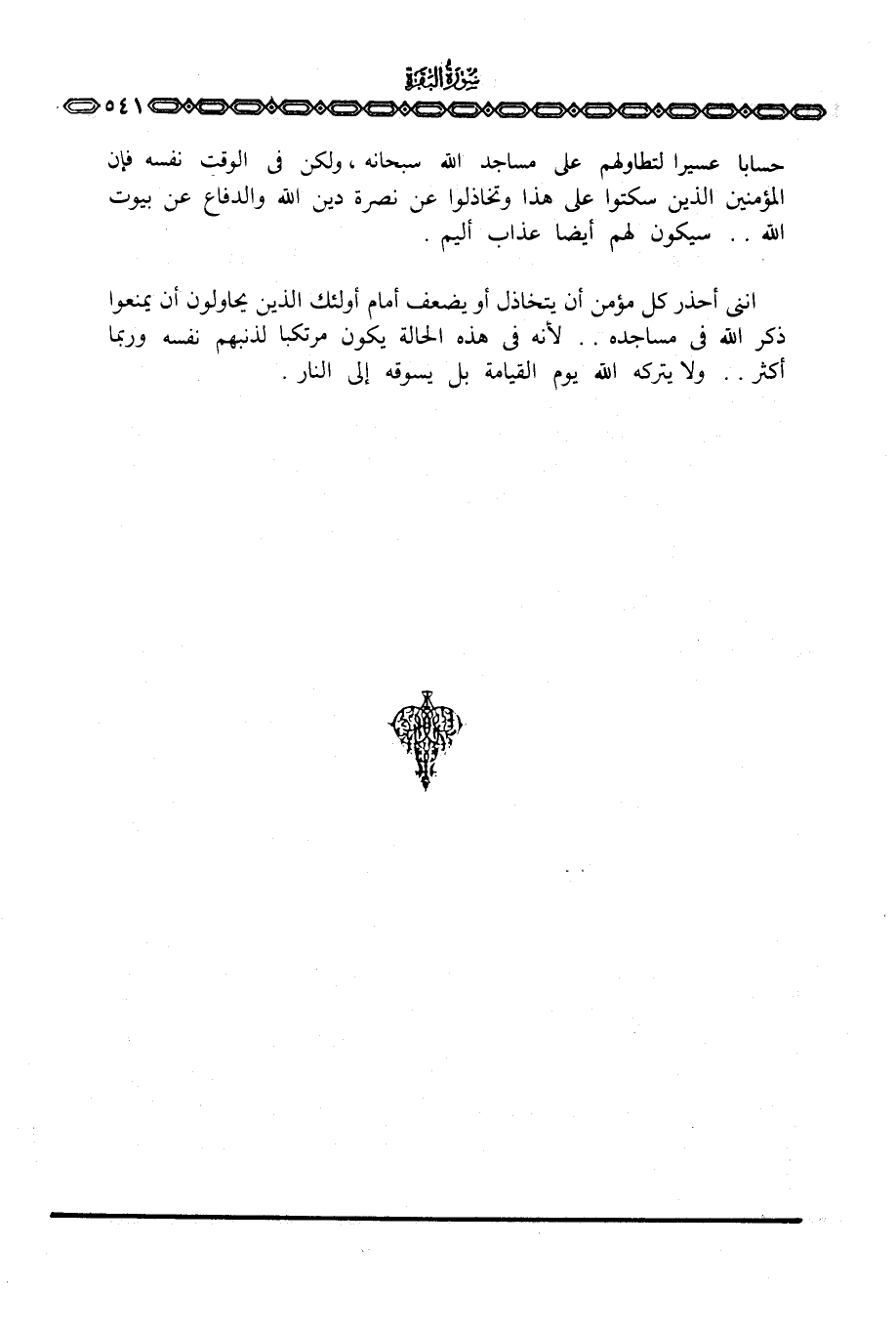 إنني أحذر كل مؤمن أن يتخاذل أو يضعف أمام أولئك الذين يحاولون أن يمنعوا ذكر الله في مساجده. . لأنه في هذه الحالة يكون مرتكبا لذنبهم نفسه وربما أكثر. . ولا يتركه الله يوم القيامة بل يسوقه إلى النار.