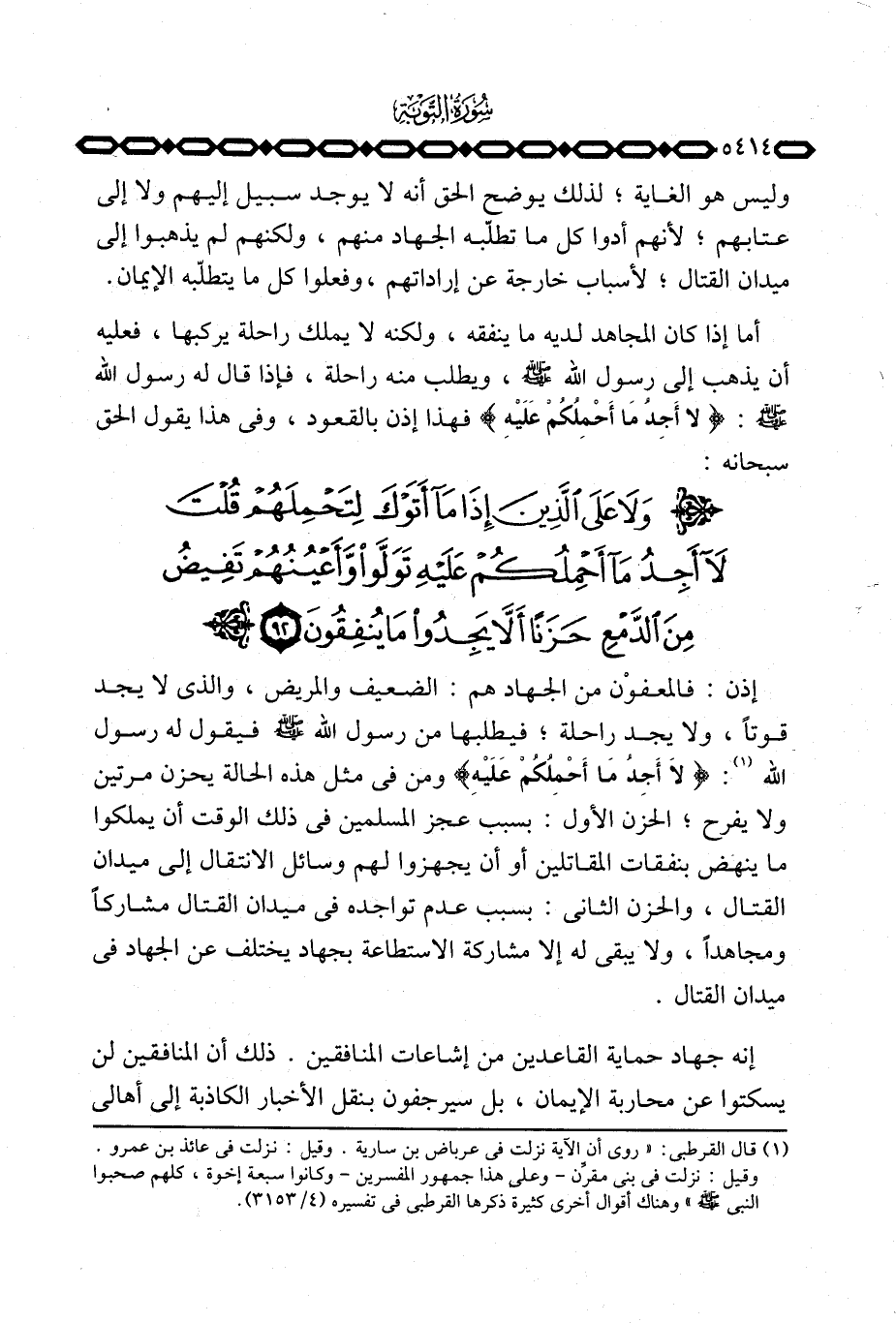 إذن: فالمعفوْن من الجهاد هم: الضعيف والمريض، والذي لا يجد قوتاً، ولا يجد راحلة؛ فيطلبها من رسول الله صَلَّى اللَّهُ عَلَيْهِ وَسَلَّم َ فيقول له رسول الله: {لاَ أَجِدُ مَآ أَحْمِلُكُمْ عَلَيْهِ} ومن في مثل هذه الحالة يحزن مرتين ولا يفرح؛ الحزن الأول: بسبب عجز المسلمين في ذلك الوقت أن يملكوا ما ينهض بنفقات المقاتلين أو أن يجهزوا لهم وسائل الانتقال إلى ميدان القتال، والحزن الثاني: بسبب عدم تواجده في ميدان القتال مشاركاً ومجاهداً، ولا يبقى له إلا مشاركة الاستطاعة بجهاد يختلف عن الجهاد في ميدان القتال.