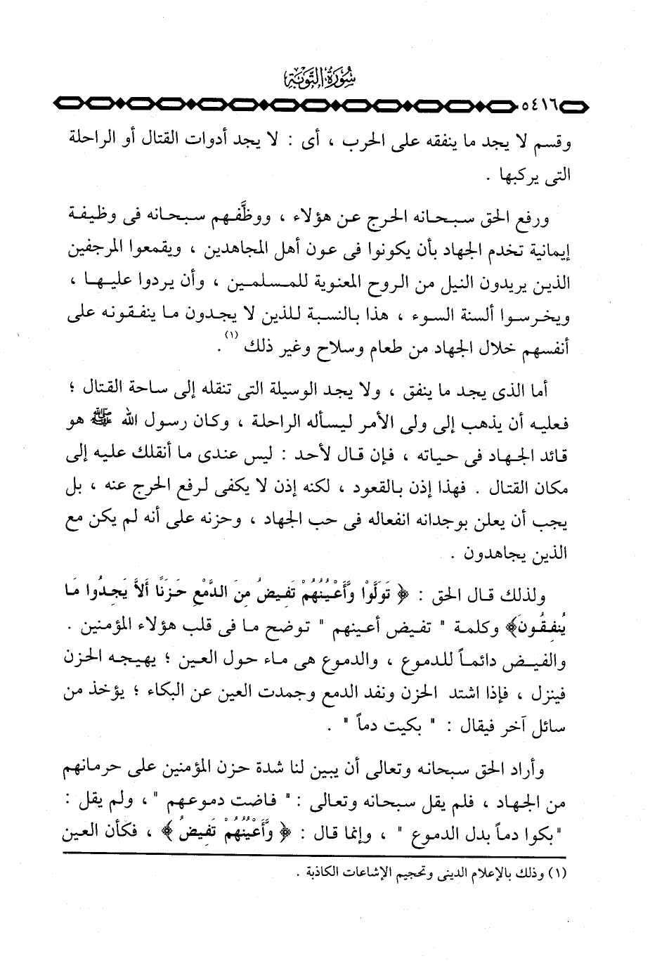 وأراد الحق سبحانه وتعالى أن يبين لنا شدة حزن المؤمنين على حرمانهم من الجهاد، فلم يقل سبحانه وتعالى: «فاضت دموعهم» ، ولم يقل: «بكوا دماً بدل الدموع» ، وإنما قال: {وَّأَعْيُنُهُمْ تَفِيضُ} ، فكأن العين