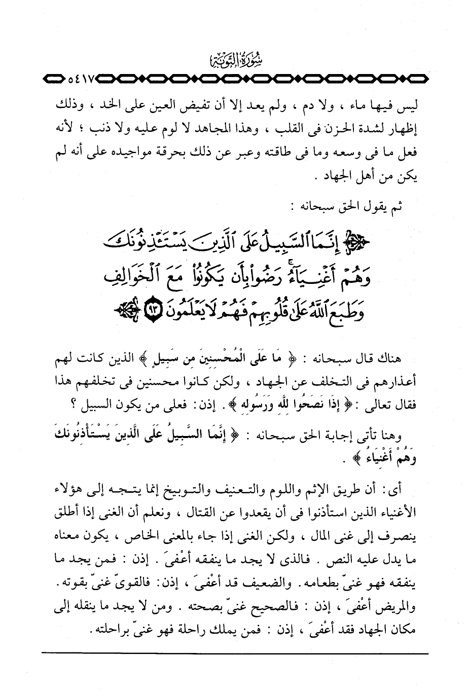 أي: أن طريق الإثم واللوم والتعنيف والتوبيخ إنما يتجه إلى هؤلاء الأغنياء الذين استأذنوا في أن يقعدوا عن القتال، ونعلم أن الغني إذا أطلق ينصرف إلى غنى المال، ولكن الغني إذا جاء بالمعنى الخاص، يكون معناه ما يدل عليه النص. فالذي لا يجد ما ينفقه أعْفيَ. إذن: فمن يجد ما ينفقه فهو غنيّ بطعامه. والضعيف قد أعفيَ، إذن: فالقويّ غنيّ بقوته. والمريض أعْفيَ، إذن: فالصحيح غنيّ بصحته، ومن لا يجد ما ينقله إلى مكان الجهاد قد أعفيَ، إذن: فمن يملك راحلة فهو غنيّ براحلته.