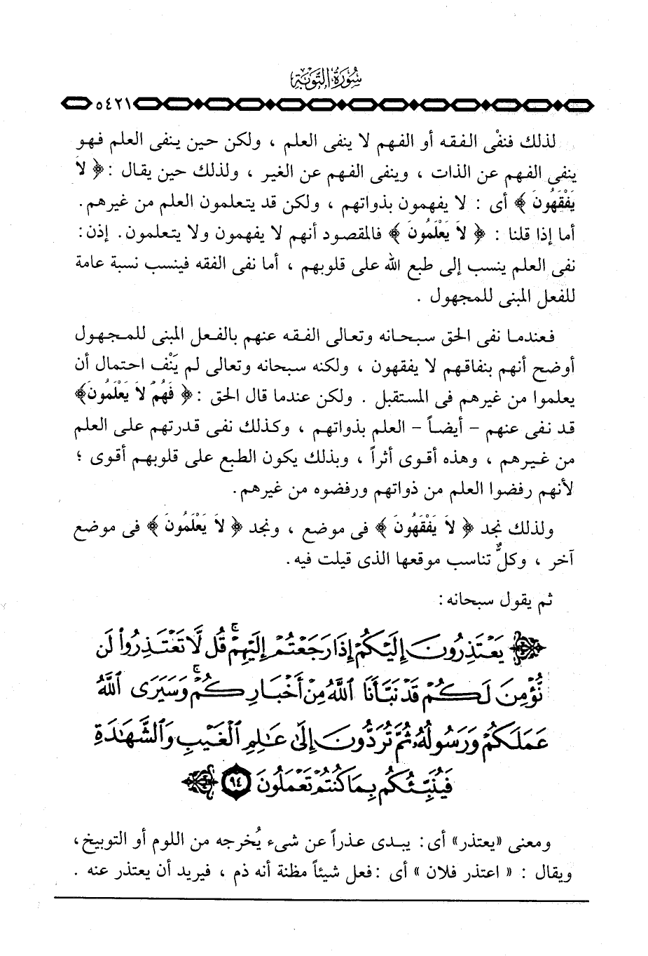 أما إذا قلنا: {لاَ يَعْلَمُونَ} فالمقصود أنهم يفهمون ولا يتعلمون. إذن: نفي العلم ينسب إلى طبع الله على قلوبهم، أما نفي الفقه فينسب نسبة عامة للفعل المبني للمجهول.