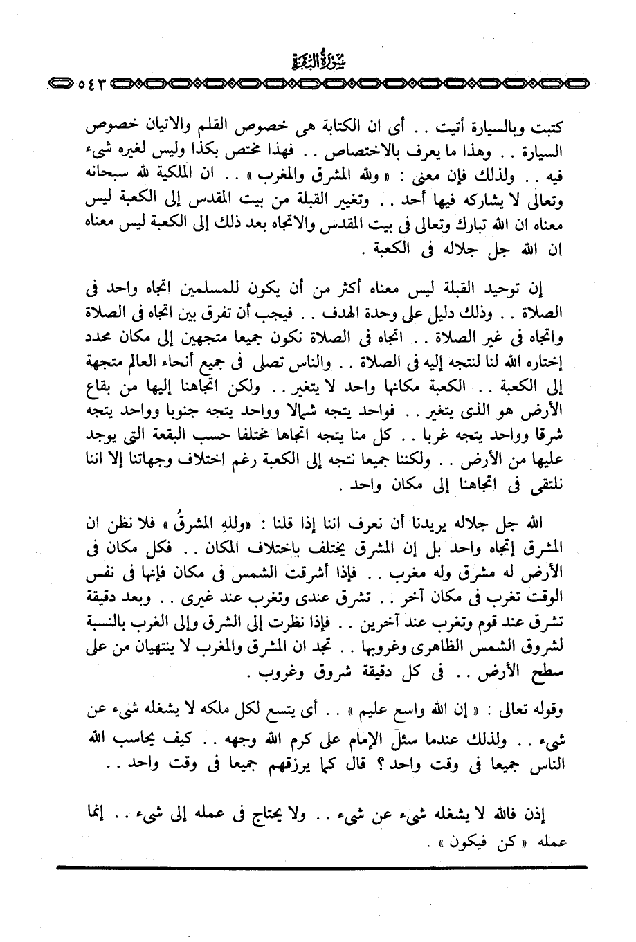 كتبت وبالسيارة أتيت. . أي أن الكتابة هي خصوص القلم والإتيان خصوص السيارة. . وهذا ما يعرف بالاختصاص. . فهذا مختص بكذا وليس لغيره شيء فيه. . ولذلك فإن معنى: {وَللَّهِ المشرق والمغرب} . . أن الملكية لله سبحانه وتعالى لا يشاركه فيها أحد. . وتغيير القبلة من بيت المقدس إلى الكعبة ليس معناه أن الله تبارك وتعالى في بيت المقدس والاتجاه بعد ذلك إلى الكعبة ليس معناه أن الله جل جلاله في الكعبة.