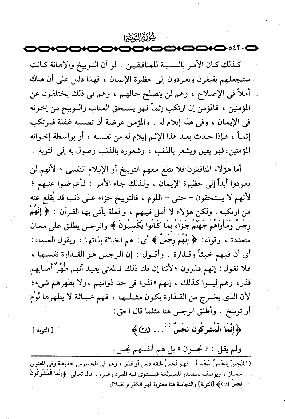كذلك كان الأمر بالنسبة للمنافقين، لو أن التوبيخ والإهانة كانت ستجعلهم يفيقون ويعودون إلى حظيرة الإيمان، فهذا دليل على أن هناك أملاً في الإصلاح، وهم لن ينصلح حالهم، وهم في ذلك يختلفون عن المؤمنين، فالمؤمن إن ارتكب إثماً فهو يستحق العتاب والتوبيخ من إخوته في الإيمان، وفي هذا إيلام له. والمؤمن عرضة أن تصيبه غفلة فيرتكب إثماً، فإذا حدث بعد هذا الألم إيلام له من نفسه، أو بواسطة إخوانه المؤمنين، فهو يفيق ويشعر بالذنب، وشعوره بالذنب وصول إلى التوبة.