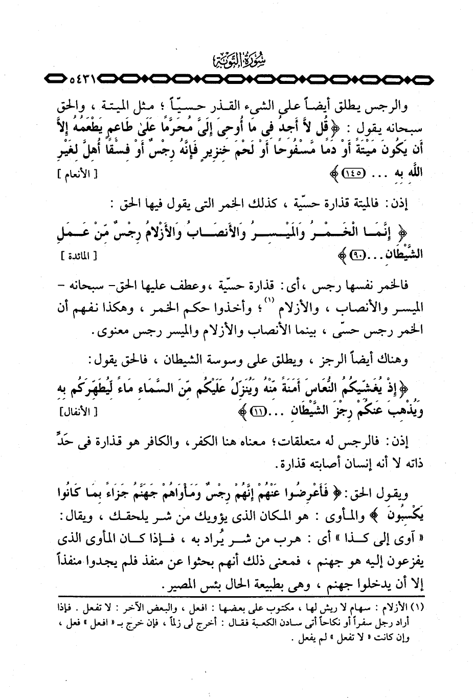 فالخمر نفسها رجس، أي: قذارة حسّية، وعطف عليها الحق - سبحانه - الميسر والأنصاب، والأزلام؛ وأخذوا حكم الخمر، وهكذا نفهم أن الخمر رجس حسّي، بينما الأنصاب والأزلام والميسر رجس معنوي.