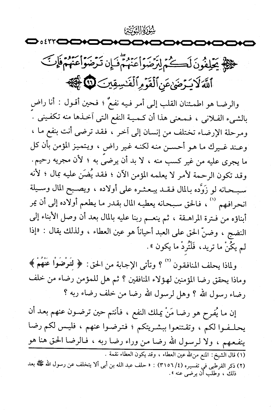 إن ما يُفرح هو رضا مَنْ يملك النفع، فأنتم حين ترضون عنهم بعد أن يحلفوا لكم، وتقتنعوا ببشريتكم؛ فترضوا عنهم، فليس لكم رضا ينفعهم، ولا لرسول الله رضا من وراء رضا ربه، فالرضا الحق هنا هو