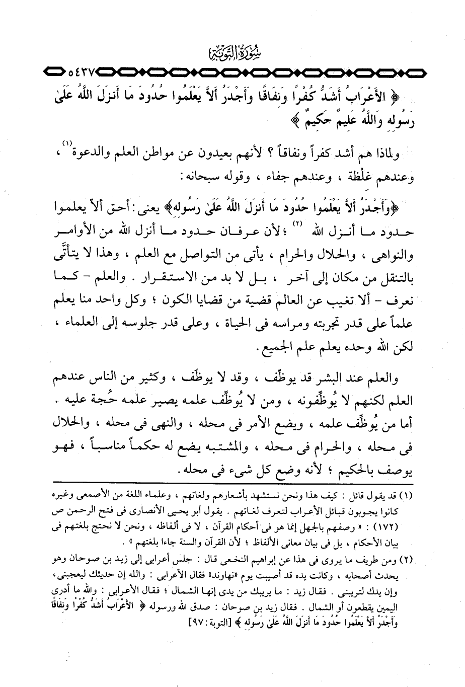 ولماذا هم أشد كفراً ونفاقاً؟ لأنهم بعيدون عن مواطن العلم والدعوة، وعندهم غِلْظة، وعندهم جفاء، وقوله سبحانه: {وَأَجْدَرُ أَلاَّ يَعْلَمُواْ حُدُودَ مَآ أَنزَلَ الله على رَسُولِهِ} يعني: أحق ألاّ يعلموا حدود ما أنزل الله؛ لأن عرفان حدود ما أنزل الله من الأوامر والنواهي، والحلال والحرام، يأتي من التواصل مع العلم، وهذا لا يتأتَّى بالتنقل من مكان إلى آخر، بل لا بد من الاستقرار.