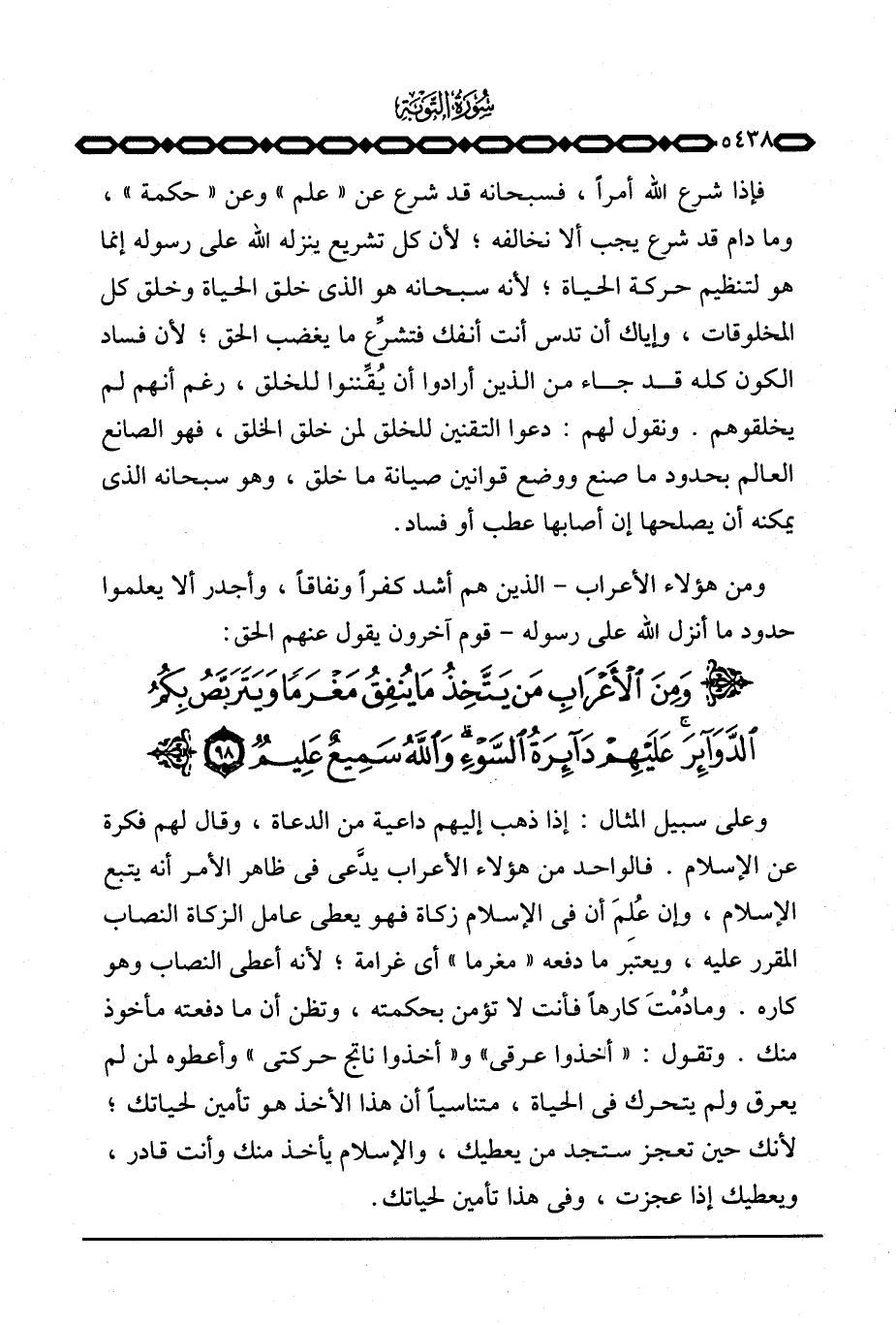وعلى سبيل المثال: إذا ذهب إليهم داعية من الدعاة، وقال لهم فكرة عن الإسلام. فالواحد من هؤلاء الأعراب يدَّعي في ظاهر الأمر أنه يتبع الإسلام، وإن عُلِمَ أن في الإسلام زكاة فهو يعطي عامل الزكاة النصاب المقرر عليه، ويعتبر ما دفعه «مغرما» أي غرامة؛ لأنه أعطى النصاب وهو كاره. وما دُمْتُ كارهاً فأنت لا تؤمن بحكمته، وتظن أن ما دفعته مأخوذ منك. وتقول: «أخذوا عرقي» و «أخذوا ناتج حركتي» وأعطوه لمن لم يعرق ولم يتحرك في الحياة، متناسياً أن هذا الأخذ هو تأمين لحياتك؛ لأنك حين تعجز ستجد من يعطيك، والإسلام يأخذ منك وأنت قادر، ويعطيك إذا عجزت، وفي هذا تأمين لحياتك.