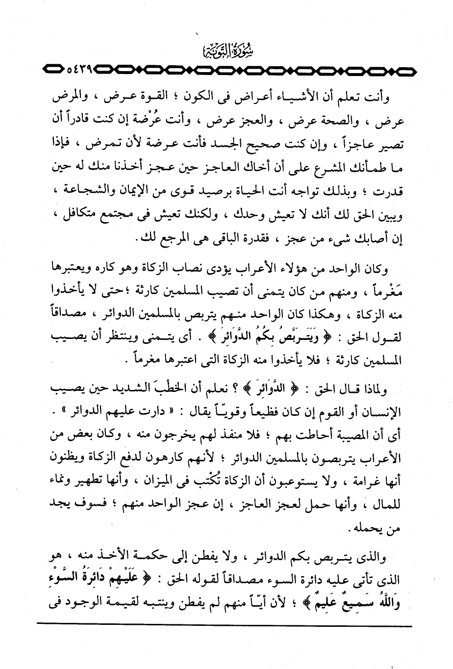 وأنت تعلم أن الأشياء أعراض في الكون؛ القوة عرض، والمرض عرض، والصحة عرض، والعجز عرض، وأنت عُرْضة إن كنت قادراً أن تصير عاجزاً، وإن كنت صحيح الجسد فأنت عرضة لأن تمرض، فإذا ما طمأنك المشرع على أن أخاك العاجز حين عجز أخذنا منك له حين قدرت؛ وبذلك تواجه أنت الحياة برصيد قوي من الإيمان والشجاعة، ويبين الحق لك أنك لا تعيش وحدك، ولكنك تعيش في مجتمع متكافل، إن أصابك شيء من عجز، فقدرة الباقي هي المرجع لك.