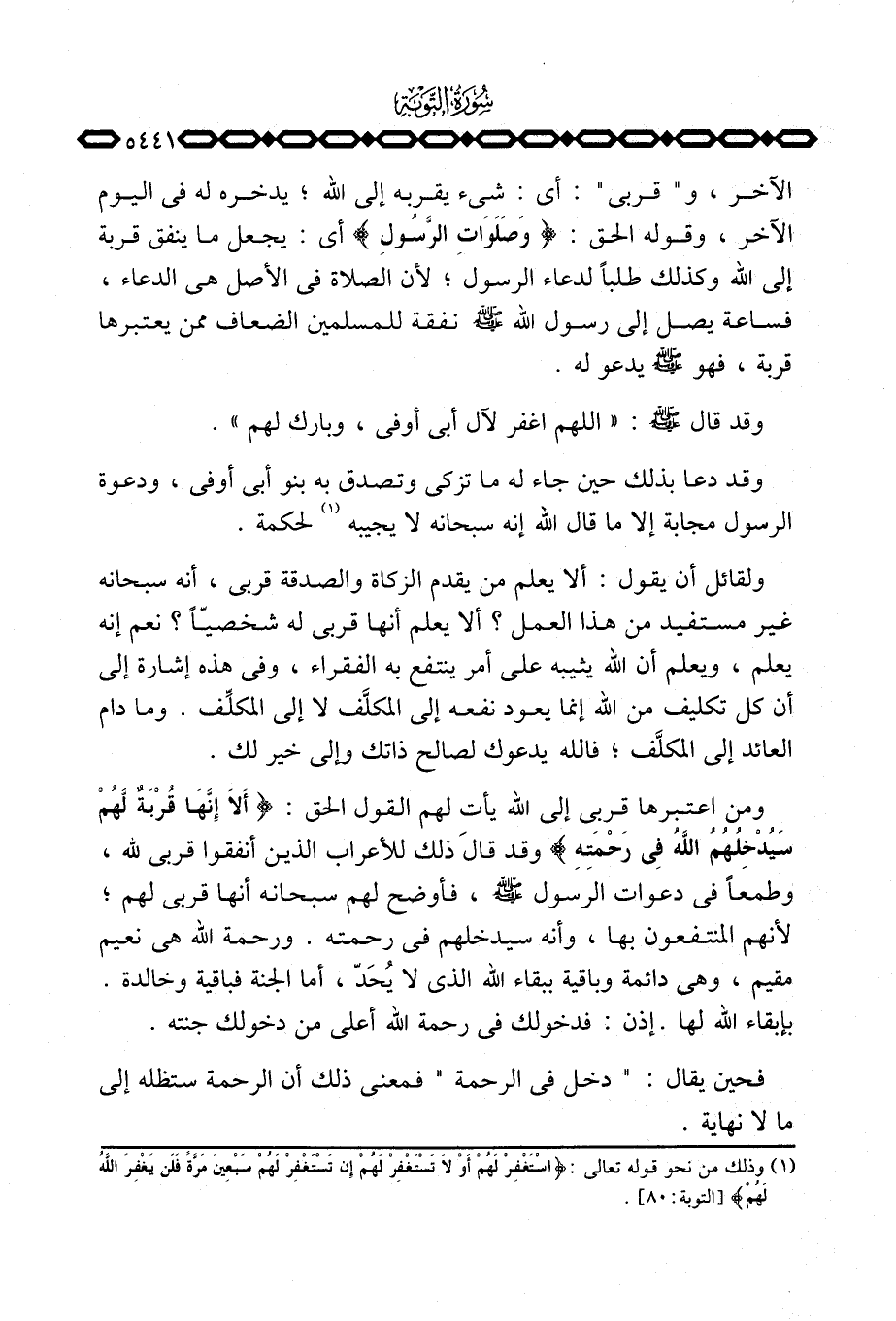 الآخر، و «قربى» : أي: شيء يقربه إلى الله؛ يدخره له في اليوم الآخر، وقوله الحق: {وَصَلَوَاتِ الرسول} أي: يجعل ما ينفق قربة إلى الله وكذلك طلباً لدعاء الرسول؛ لأن الصلاة في الأصل هي الدعاء، فساعة يصل إلى رسول الله صَلَّى اللَّهُ عَلَيْهِ وَسَلَّم َ نفقة للمسلمين الضعاف ممن يعتبرها قربة، فهو صَلَّى اللَّهُ عَلَيْهِ وَسَلَّم َ يدعو له.