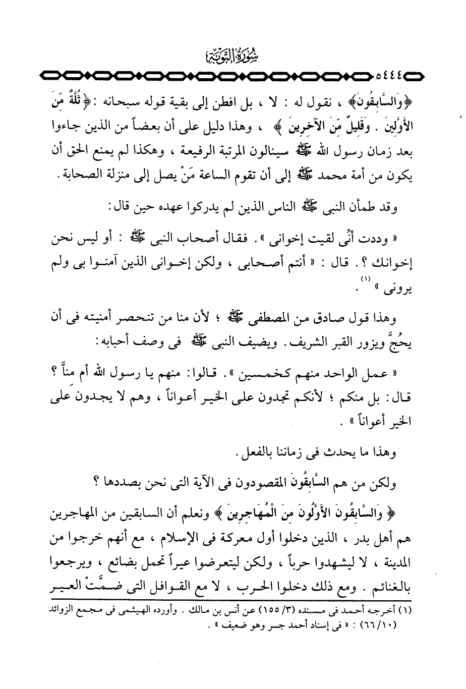 {والسابقون الأولون مِنَ المهاجرين} ونعلم أن السابقين من المهاجرين هم أهل بدر، الذين دخلوا أول معركة في الإسلام، مع أنهم خرجوا من المدينة، لا ليشهدوا حرباً، ولكن ليعترضوا عيراً تحمل بضائع، ويرجعوا بالغنائم. ومع ذلك دخلوا الحرب، لا مع القوافل التي ضمَّتْ العير