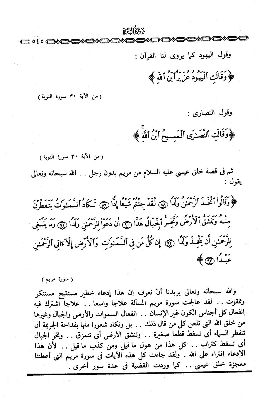 والله سبحانه وتعالى يريدنا أن نعرف أن هذا إدعاء خطير مستقبح مستنكر وممقوت. . لقد عالجت سورة مريم المسألة علاجا واسعا. . علاجا اشترك فيه انفعال كل أجناس الكون غير الإنسان. . انفعال السموات والأرض والجبال وغيرها من خلق الله التي تلعن كل من قال ذلك. . بل وتكاد شعورا منها بفداحة الجريمة أن تنفطر السماء أي تسقط قطعا صغيرة. . وتنشق الأرض أي تتمزق. . وتخر الجبال أي تسقط كتراب. . كل هذا من هول ما قيل ومن كذب ما قيل. . لأن هذا الادعاء افتراء على الله. ولقد جاءت كل هذه الآيات في سورة مريم التي أعطتنا معجزة خلق عيسى. . كما وردت القضية في عدة سور أخرى.