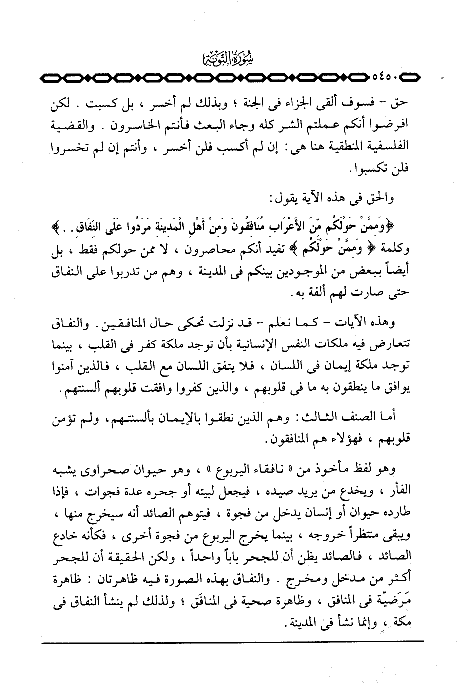 وهو لفظ مأخوذ من «نافقاء اليربوع» وهو حيوان صحراوي يشبه الفأر، ويخدع من يريد صيده، فيجعل لبيته أو جحره عدة فجوات، فإذا طارده حيوان أو إنسان يدخل من فجوة، فيتوهم الصائد أنه سيخرج منها، ويبقى منتظراً خروجه، بينما يخرج اليربوع من فجوة أخرى، فكأنه خادع الصائد، فالصائد يظن أن للجحر باباً واحداً، ولكن الحقيقة أن للجحر أكثر من مدخل ومخرج. والنفاق بهذه الصورة فيه ظاهرتان: ظاهرة مَرَضيّة في المنافق، وظاهرة صحية في المنافَق؛ ولذلك لم ينشأ النفاق في مكة، وإنما نشأ في المدينة.