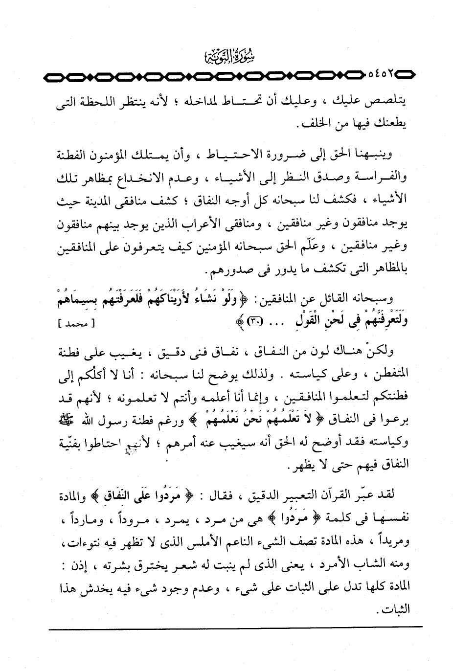 وينبهنا الحق إلى ضرورة الاحتياط، وأن يمتلك المؤمنون الفطنة والفراسة وصدق النظر إلى الأشياء، فكشف لنا سبحانه كل أوجه النفاق؛ كشف منافقي المدينة حيث يوجد منافقون وغير منافقين، ومنافقي الأعراب الذين يوجد بينهم منافقون وغير منافقين، وعَلّم الحق سبحانه المؤمنين كيف يتعرفون على المنافقين بالمظاهر التي تكشف ما يدور في صدورهم.