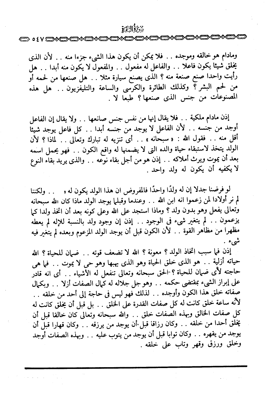لو فرضنا جدلا إن له ولداً واحداً فالمفروض أن هذا الولد يكون له. . ولكننا لم نر أولادا لمن زعموا أنه ابن الله. . وعندما وقبلما يوجد الولد ماذا كان الله سبحانه وتعالى يفعل وهو بدون ولد؟ وماذا استجد على الله وعلى كونه بعد أن اتخذ ولدا كما يزعمون. . لم يتغير شيء في الوجود. . إذن إن وجود ولد بالنسبة للإله لم يعطه مظهرا من مظاهر القوة. . لأن الكون قبل أن يوجد الولد المزعوم وبعده لم يتغير فيه شيء.