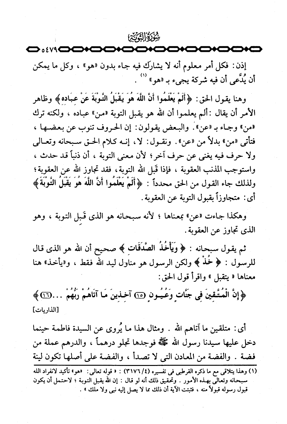 وهنا يقول الحق: {أَلَمْ يعلموا أَنَّ الله هُوَ يَقْبَلُ التوبة عَنْ عِبَادِهِ} وظاهر الأمر أن يقال: ألم يعلموا أن الله هو يقبل التوبة «من» عبادة، ولكنه ترك «من» وجاء ب «عن» . والبعض يقولون: إن الحروف تنوب عن بعضها، فتأتي «من» بدلاً من «عن» . ونقول: لا، إنه كلام الحق سبحانه وتعالى ولا حرف فيه يغني عن حرف آخر؛ لأن معنى التوبة، أن ذنباً قد حدث، واستوجب المذنب العقوبة، فإذا قَبل الله التوبة، فقد تجاوز الله عن العقوبة؛ ولذلك جاء القول من الحق محدداً: {أَلَمْ يعلموا أَنَّ الله هُوَ يَقْبَلُ التوبة} أي: متجاوزاً بقبول التوبة عن العقوبة.