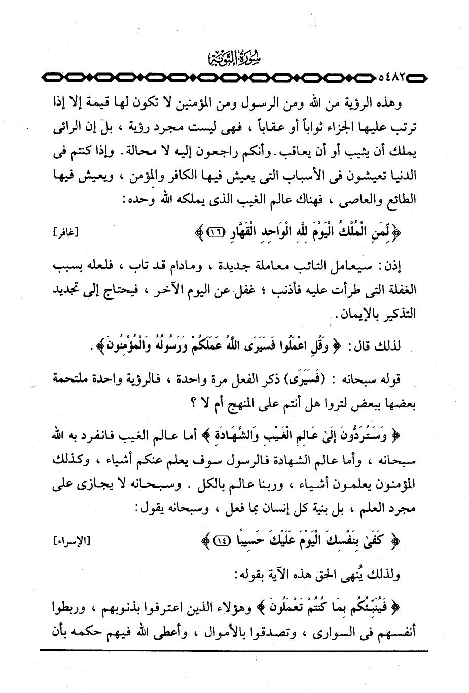 وهذه الرؤية من الله ومن الرسول ومن المؤمنين لا تكون لها قيمة إلا إذا ترتب عليها الجزاء ثواباً أو عقاباً، فهي ليست مجرد رؤية، بل إن الرائي يملك أن يثيب أو أن يعاقب. وأنكم راجعون إليه لا محالة. وإذا كنتم في الدنيا تعيشون في الأسباب التي يعيش فيها الكافر والمؤمن، ويعيش فيها الطائع والعاصي، فهناك عالم الغيب الذي يملكه الله وحده: {لِّمَنِ الملك اليوم لِلَّهِ الواحد القهار} [غافر: 16]