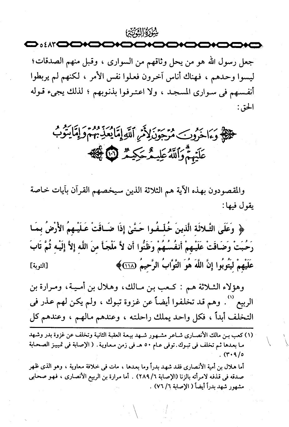 والمقصودون بهذه الآية هم الثلاثة الذين سيخصهم القرآن بآيات خاصة يقول فيها: {وَعَلَى الثلاثة الذين خُلِّفُواْ حتى إِذَا ضَاقَتْ عَلَيْهِمُ الأرض بِمَا رَحُبَتْ وَضَاقَتْ عَلَيْهِمْ أَنفُسُهُمْ وظنوا أَن لاَّ مَلْجَأَ مِنَ الله إِلاَّ إِلَيْهِ ثُمَّ تَابَ عَلَيْهِمْ ليتوبوا إِنَّ الله هُوَ التواب الرحيم} [التوبة: 118]