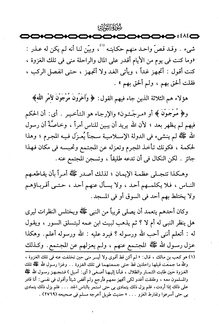 شيء، وقد قصّ واحد منهم حكايته، وبيّن لنا أنه لم يكن له عذر: «وما كنت في يوم من الأيام أقدر على المال والراحلة مني في تلك الغزوة، كنت أقول: أتجهز غداً، ويأتي الغد ولا أتجهز، حتى أنفصل الركب، فقلت ألحق بهم، ولم ألحق بهم» .