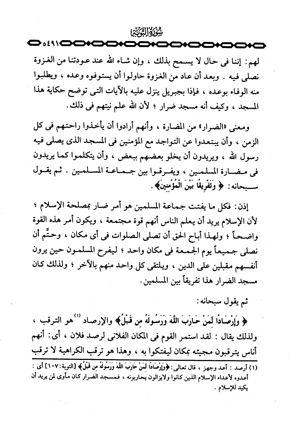 إذن: فكل ما يفتت جماعة المسلمين هو أمر ضار بمصلحة الإسلام؛ لأن الإسلام يريد أن يعلم الناس أنهم قوة مجتمعة، ويكون أمر هذه القوة واضحاً؛ ولهذا أباح الحق أن تصلي الصلوات في أي مكان، وحتَّم أن نصلي جميعاً يوم الجمعة في مكان واحد؛ ليفرح المسلمون حين يرون أنفسهم مقبلين على الدين، ويلتقي كل واحد منهم بالآخر؛ ولذلك كان مسجد الضرار هذا تفريقاً بين المسلمين.