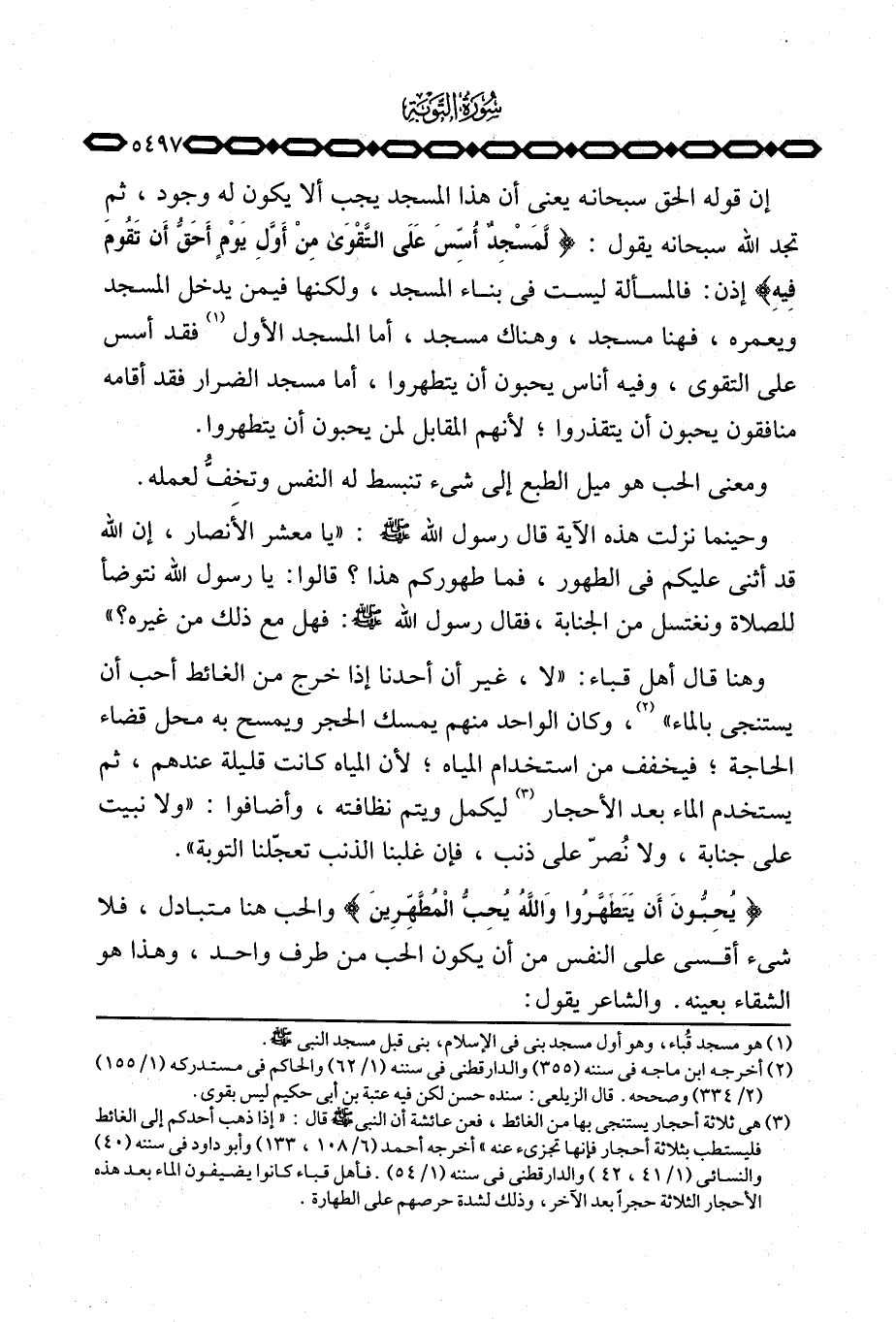 وهنا قال أهل قباء: «لا، غير أن أحدنا إذا خرج من الغائط أحب أن يستنجي بالماء» ، وكان الواحد منهم يمسك الحجر ويمسح به محل قضاء الحاجة؛ فيخفف من استخدام المياه؛ لأن المياه كانت قليلة عندهم، ثم يستخدم الماء بعد الأحجار ليكمل ويتم نظافته، وأضافوا: «ولا نبيت على جنابة، ولا نُصرّ على ذنب، فإن غلبنا الذنب تعجّلنا التوبة» .