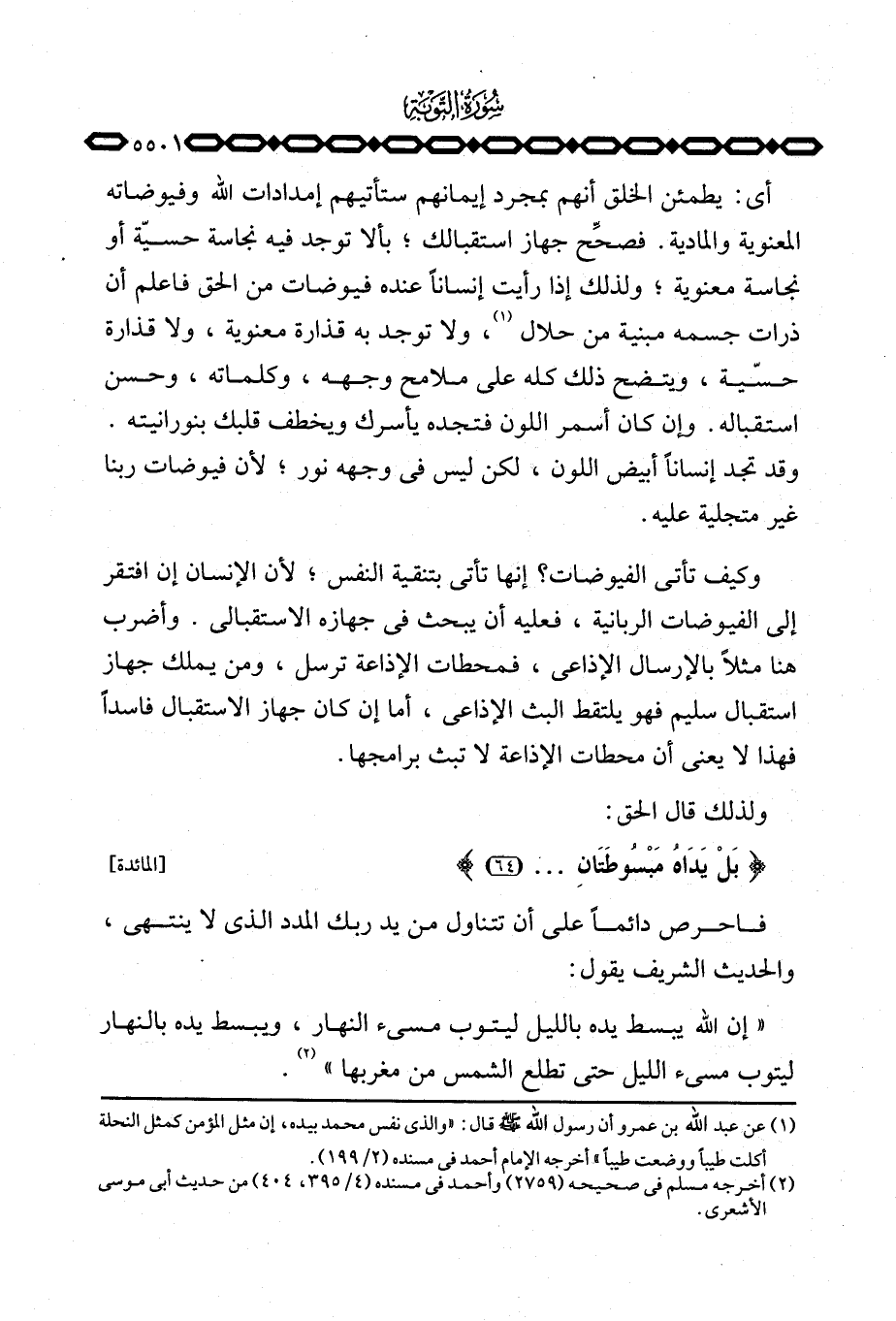 وكيف تأتي الفيوضات؟ إنها تأتي بتنقية النفس؛ لأن الإنسان إن افتقر إلى الفيوضات الربانية، فعليه أن يبحث في جهازه الاستقبالي. وأضرب هنا مثلاً بالإرسال الإذاعي، فمحطات الإذاعة ترسل، ومن يملك جهاو استقبال سليم فهو يلتقط البث الإذاعي، أما إن كان جهاز الاستقبال فاسداً فهذا لا يعني أن محطات الإذاعة لا تبث برامجها.