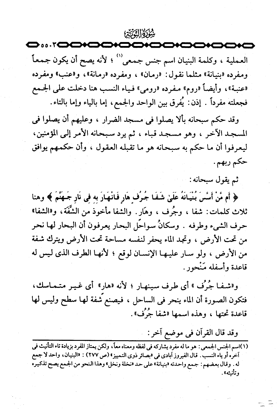 {أَم مَّنْ أَسَّسَ بُنْيَانَهُ على شَفَا جُرُفٍ هَارٍ فانهار بِهِ فِي نَارِ جَهَنَّمَ} وهنا ثلاث كلمات: شفا، وجُرف، وهَار. والشفا مأخوذ من الشَّفَة، و» الشفا «حرف الشيء وطرفه. وسكانُ سواحل البحار يعرفون أن البحار لها نحر من تحت الأرض، وتجد الماء يحفر لنفسه مساحة تحت الأرض ويترك شفة من الأرض، ولو سار عليها الإنسان لوقع؛ لأنها الطرف الذي ليس له قاعدة وأسفله مَنْحور.