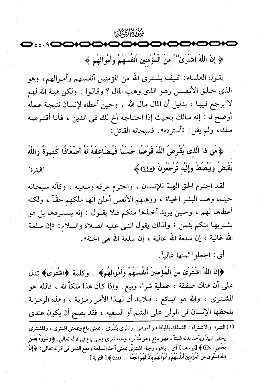 يقول العلماء: كيف يشتري الله من المؤمنين أنفسهم وأموالهم، وهو الذي خلق الأنفس وهو الذي وهب المال؟ وقالوا: ولكن هبة الله لهم لا يرجع فيها، بدليل أن المال مال الله، وحين أعطاه لإنسان نتيجة عمله أوضح له: إنه مالك بحيث إذا احتاجه أخ لك في الدين، فأنا أقترضه منك، ولم يقل: «أسترده» . فسبحانه القائل: {مَّن ذَا الذي يُقْرِضُ الله قَرْضاً حَسَناً فَيُضَاعِفَهُ لَهُ أَضْعَافاً كَثِيرَةً والله يَقْبِضُ وَيَبْسُطُ وَإِلَيْهِ تُرْجَعُونَ} [البقرة: 245]