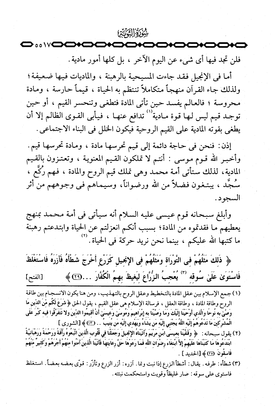 وأبلغ سبحانه قوم عيسى عليه السلام أنه سيأتي في أمة محمد بمنهج يعطيهم ما فقدتموه من المادة؛ بسبب أنكم انعزلتم عن الحياة وابتدعتم رهبنة ما كتبها الله عليكم، بينما نحن نريد حركة في الحياة. {ذَلِكَ مَثَلُهُمْ فِي التوراة وَمَثَلُهُمْ فِي الإنجيل كَزَرْعٍ أَخْرَجَ شَطْأَهُ فَآزَرَهُ فاستغلظ فاستوى على سُوقِهِ يُعْجِبُ الزراع لِيَغِيظَ بِهِمُ الكفار ... } [الفتح: 29]