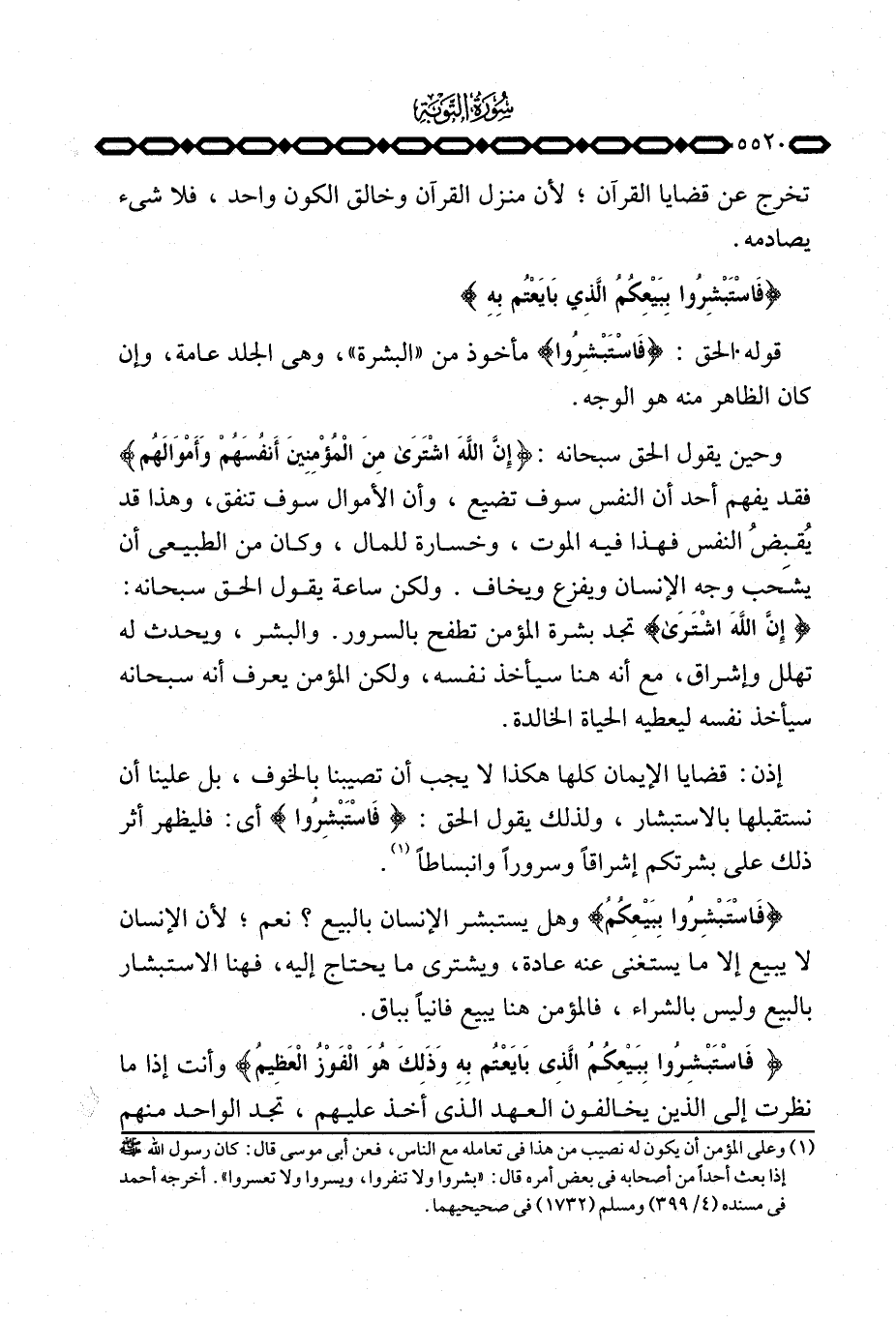 وحين يقول الحق سبحانه: {إِنَّ الله اشترى مِنَ المؤمنين أَنفُسَهُمْ وَأَمْوَالَهُمْ} فقد يفهم أحد أن النفس سوف تضيع، وأن الأموال سوف تنفق، وهذا قد يُقبِضُ النفس فهذا فيه الموت، وخسارة للمال، وكان من الطبيعي أن يشحب وجه الإنسان ويفزع ويخاف. ولكن ساعة يقول الحق سبحانه: {إِنَّ الله اشترى} يجد بشرة المؤمن تطفح بالسرور. والبشر، ويحدث له تهلل وإشراق، مع أنه هنا سيأخذ نفسه، ولكن المؤمن يعرف أنه سبحانه سيأخذ نفسه ليعطيه الحياة الخالدة.