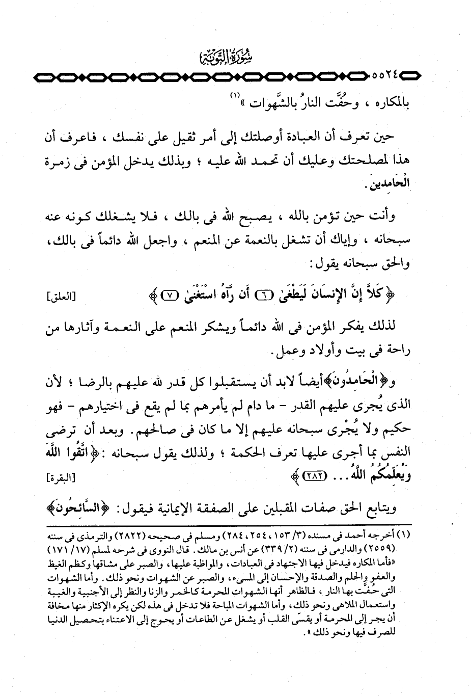 حين تعرف أن العبادة أوصلتك إلى أمر ثقيل على نفسك، فاعرف أن هذا لمصلحتك وعليك أن تحمد الله عليه؛ وبذلك يدخل المؤمن في زمرة الحَامِدينَ.