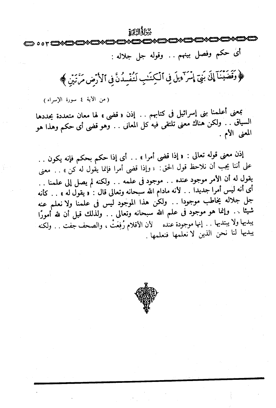 بمعنى أعلمنا بني إسرائيل في كتابهم. . إذن «قضى» لها معان متعددة يحددها السياق. . ولكن هناك معنى تلتقي فيه كل المعاني. . وهو قضى أي حكم وهذا هو المعنى الأم.