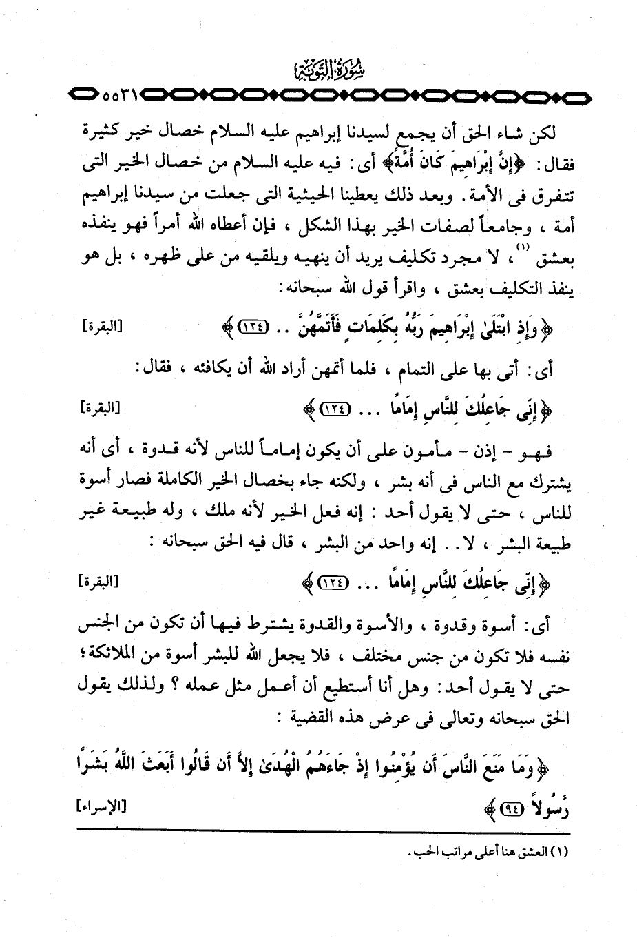 لكن شاء الحق أن يجمع لسيدنا إبراهيم عليه السلام خصال خير كثيرة فقال: {إِنَّ إِبْرَاهِيمَ كَانَ أُمَّةً} أي: فيه عليه السلام من خصال الخير التي تتفرق في الأمة. وبعد ذلك يعطينا الحيثية التي جعلت من سيدنا إبراهيم أمة، وجامعاً لصفات الخير بهذا الشكل، فإن أعطاه الله أمراً فهو ينفذه بعشق، لا مجرد تكليف يريد أن ينهيه ويلقيه من على ظهره، بل هو ينفذ التكليف بعشق، واقرأ قول الله سبحانه: {وَإِذِ ابتلى إِبْرَاهِيمَ رَبُّهُ بِكَلِمَاتٍ فَأَتَمَّهُنَّ ... } [البقرة: 124]