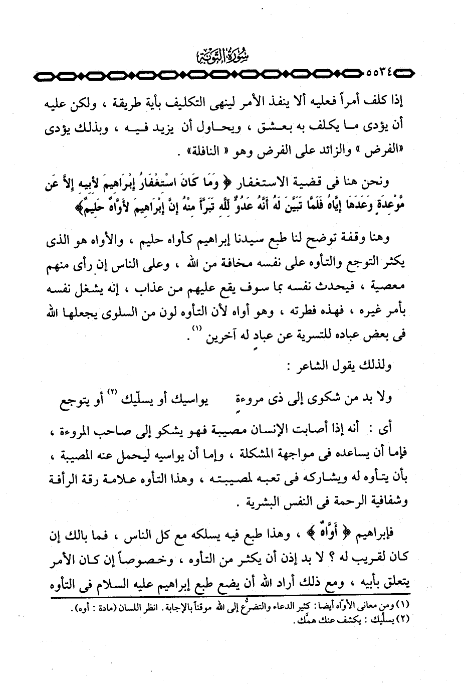 فإبراهيم {أَوَّاهٌ} ، وهذا طبع فيه يسلكه مع كل الناس، فما بالك إن كان لقريب له؟ لا بد إذن أن يكثر من التأوه، وخصوصاً إن كان الأمر يتعلق بأبيه، ومع ذلك أراد الله أن يضع طبع إبراهيم عليه السلام في التأوه