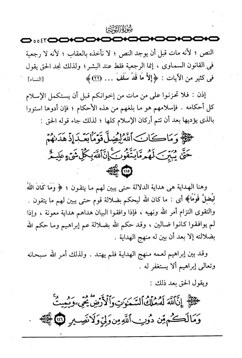 وهنا الهداية هي هداية الدلالة حتى يبين لهم ما يتقون؛ {وَمَا كَانَ الله لِيُضِلَّ قَوْماً} أي: ما كان الله ليحكم بضلالة قوم حتى يبين لهم ما يتقون. والتقوى التزام أمر الله ونهيه، فإذا وافقوا البيان هداهم هداية معونة، وإذا لم يوافقوا كانوا ضالين، وقد حكم الله بضلالة عم إبراهيم وما حكم الله بضلالته إلا بعد أن بين له منهج الهداية.