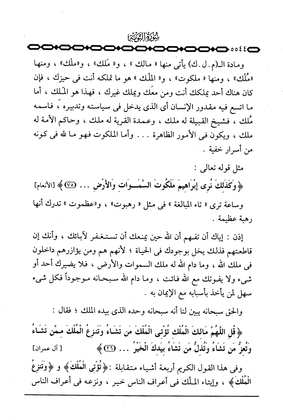 ومادة ال (م. ل. ك) يأتي منها «مالك» ، و «مَلك» ، و «ملْك» ، ومنها «مُلْك» ، ومنها «ملكوت» ، و «المِلْك» هو ما تملكه أنت في حيزك، فإن كان هناك أحد يملكك أنت ومن معك ويملك غيرك، فهذا هو المَلِك، أما ما اتسع فيه مقدور الإنسان أي الذي يدخل في سياسته وتدبيره، فاسمه مُلك، فشيخ القبيلة له ملك، وعمدة القرية له ملك، وحاكم الأمة له ملك، ويكون في الأمور الظاهرة ... واما الملكوت فهو ما لله في كونه من أسرار خفية.