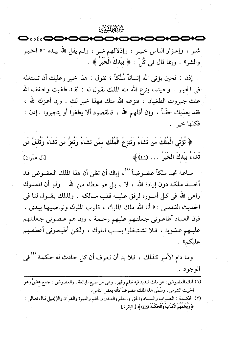 ساعة تجد ملكاً عضوضاً، إياك أن تظن أن هذا الملك العضوض قد أخذ ملكه دون إرادة الله، لا، بل هو عطاء من الله. ولو أن المملوك راعى الله في كل أموره لرقق عليه قلب مالكه. ولذلك يقول لنا في الحديث القدسي: «أنا الله ملك الملوك، قلوب الملوك ونواصيها بيدي، فإن العباد أطاعوني جعلتهم عليهم رحمة، وإن هم عصوني جعلتهم عليهم عقوبة، فلا تشتغلوا بسب الملوك، ولكن أطيعوني أعطفهم عليكم»